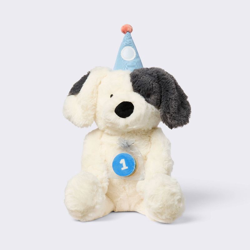 - Cream-and -black faux-fur dog with a birthday cap with age display