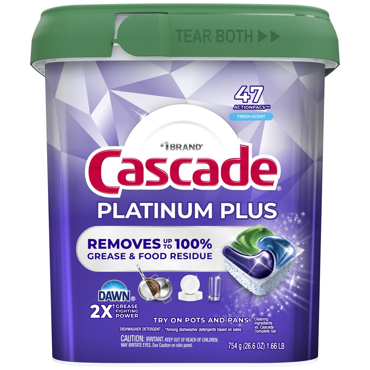 Meet Our Best Clean. Cascade Platinum Plus dishwasher ActionPacs give your dishes a breakthrough clean with up to 100% of grease and food residue removal. Loaded with 2X* the Dawn grease fighting powe…