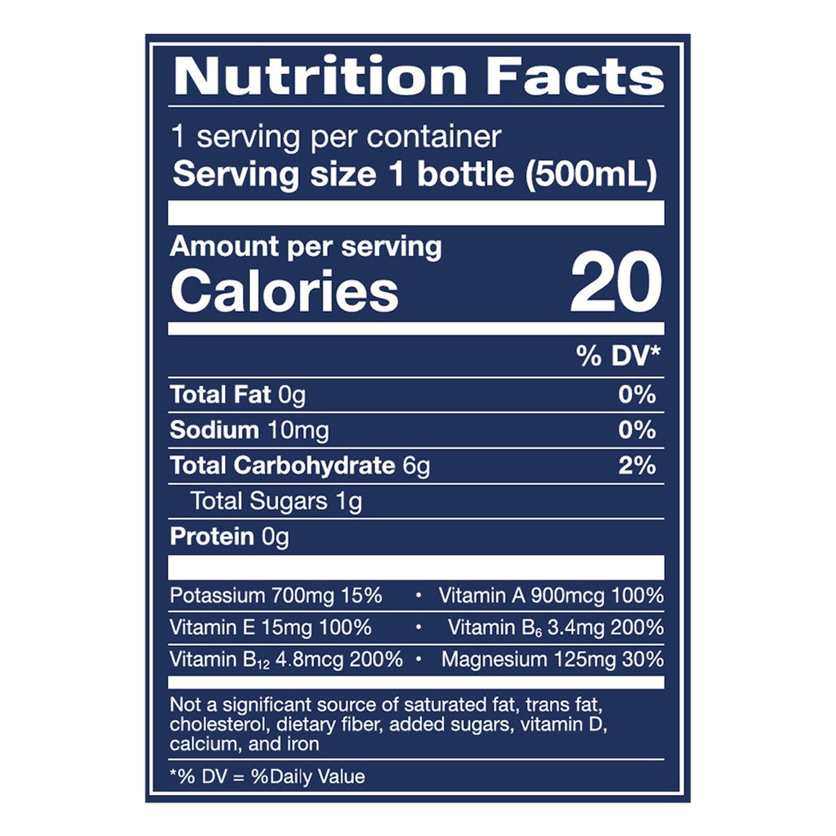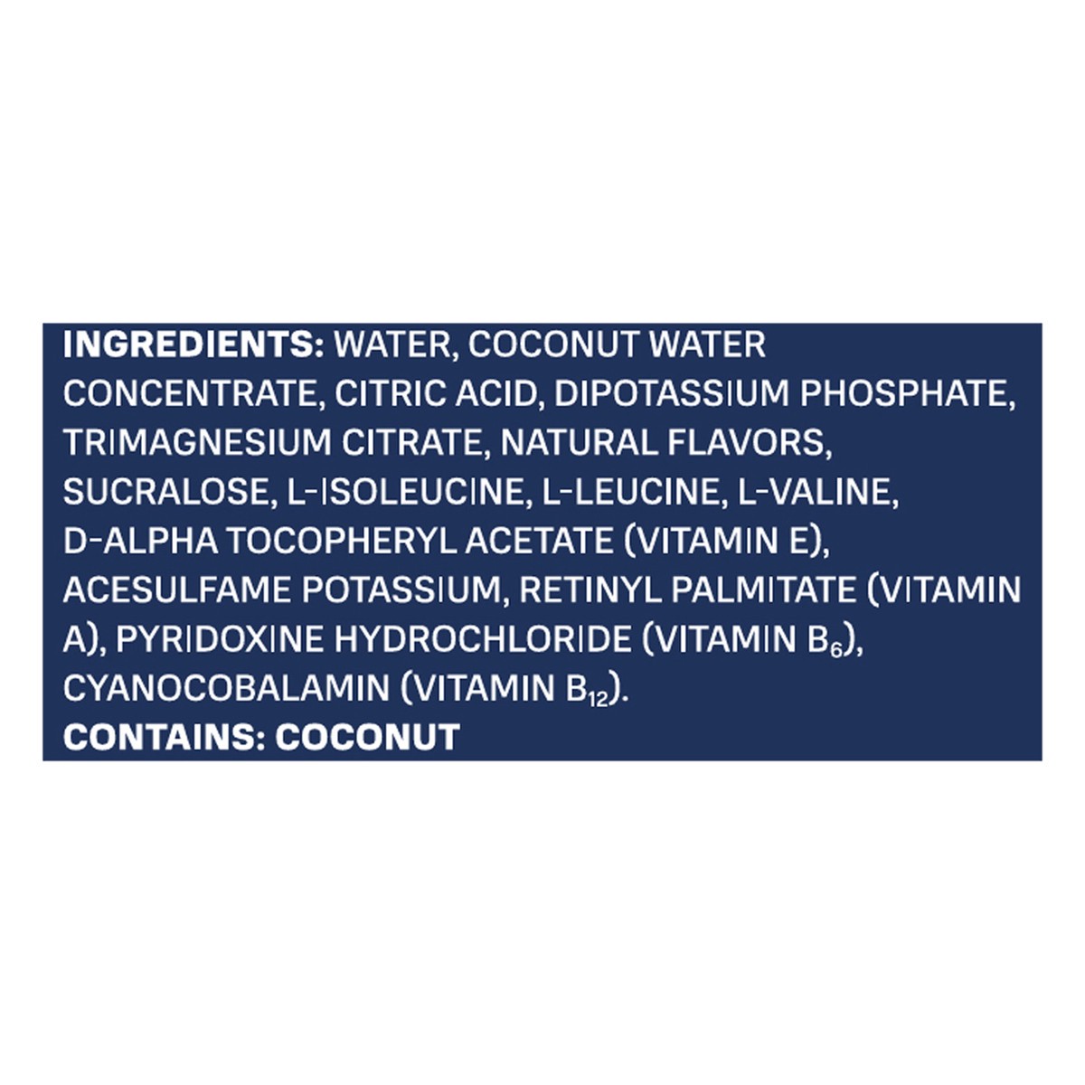 Water, Coconut Water Concentrate, Citric Acid, Dipotassium Phosphate, Trimagnesium Citrate, Natural Flavors, Sucralose, L-Isoleucine, L-Leucine, L-Valine, D-Alpha Tocopheryl Acetate (Vitamin E), Acesu…