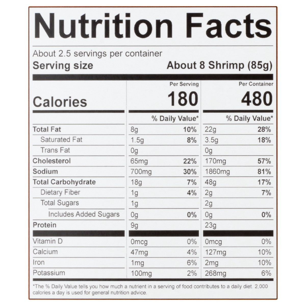 Shrimp, Enriched Bleached Wheat Flour (Wheat Flour, Niacin, Reduced Iron, Thiamine Mononitrate, Riboflavin, Folic Acid), Water, Soybean Oil, Wheat Flour, Modified Corn Starch, Yellow Corn Flour, Conta…