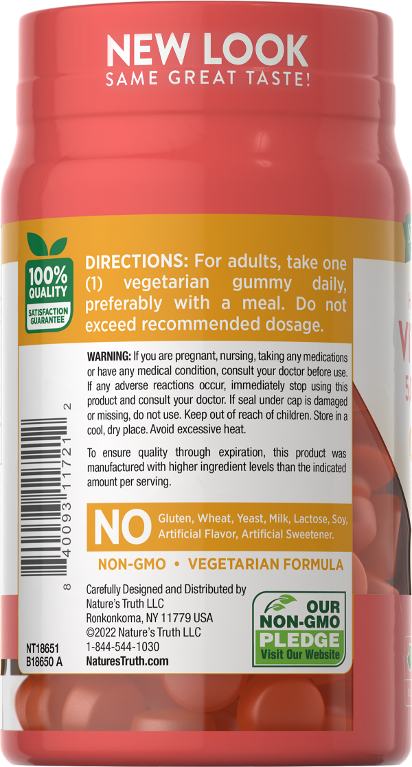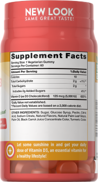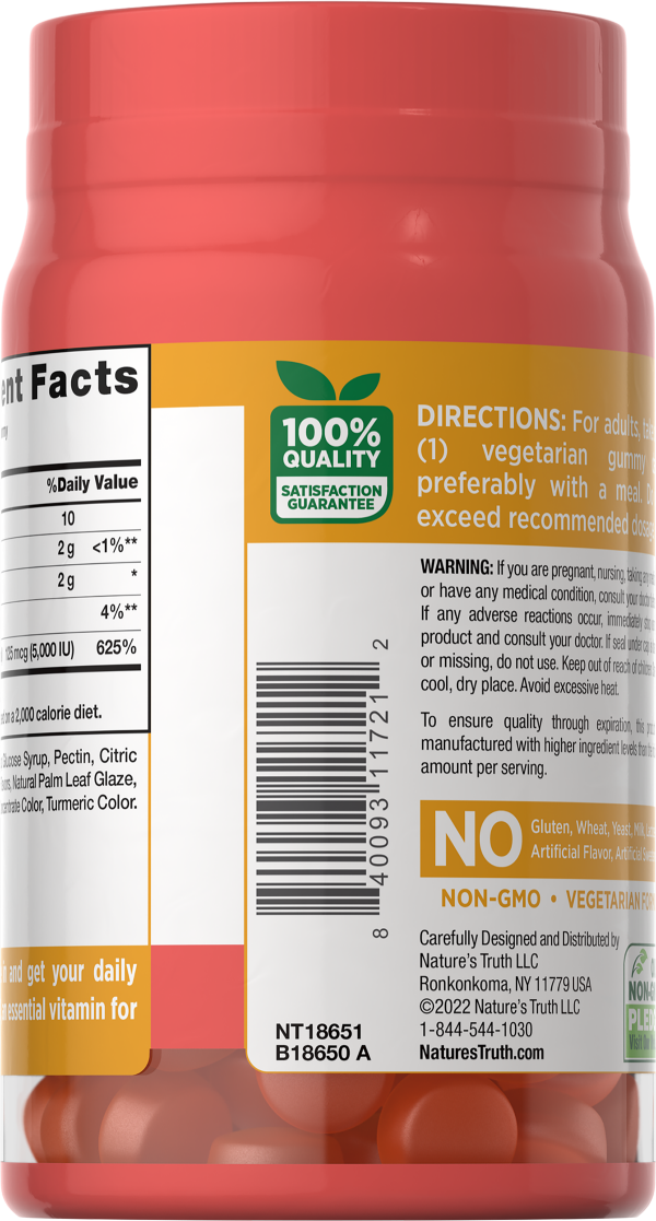 Dietary Supplement. 5,000 IU (125 MCG). Gluten free. No gluten, wheat, yeast, milk, lactose, soy, artificial flavor, artificial sweetener. Vegetarian formula. Non-GMO. Our non-GMO pledge. Visit our we…