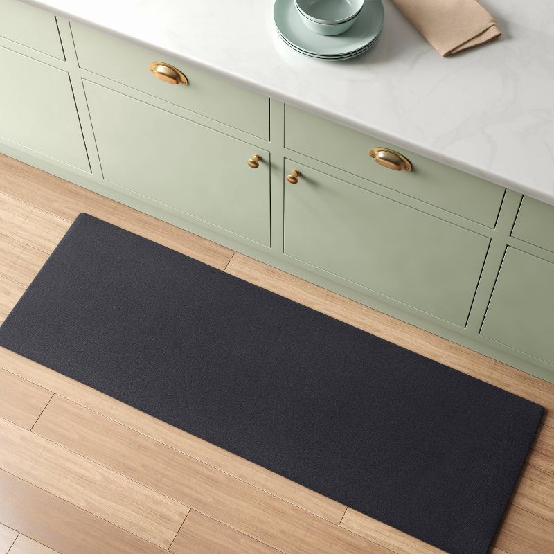 Create a stylish look in the busiest room of your house with the Low Profile Kitchen Runner from Room Essentials™. This rectangular kitchen runner comes in a black hue for a stylish look that blends w…