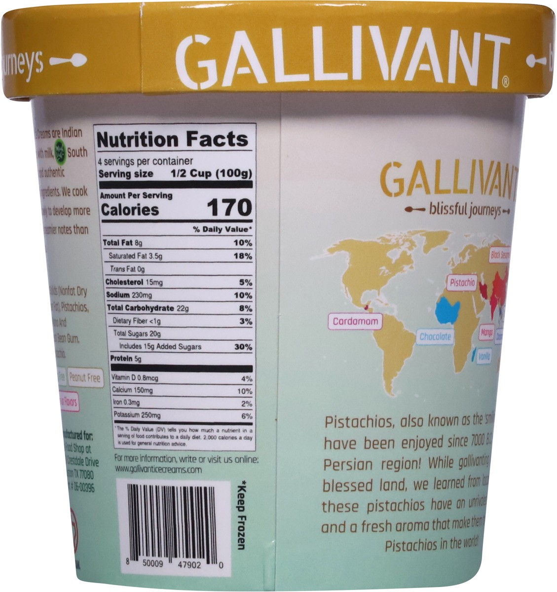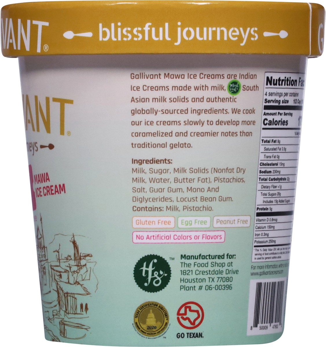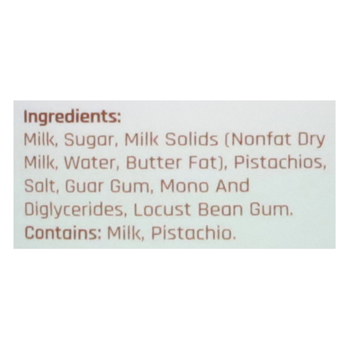 Milk, Sugar, Milk Solids (Nonfat Dry Milk, Water, Butter Fat), Pistachios, Salt, Guar Gum, Mono and Diglycerides, Locust Bean Gum.