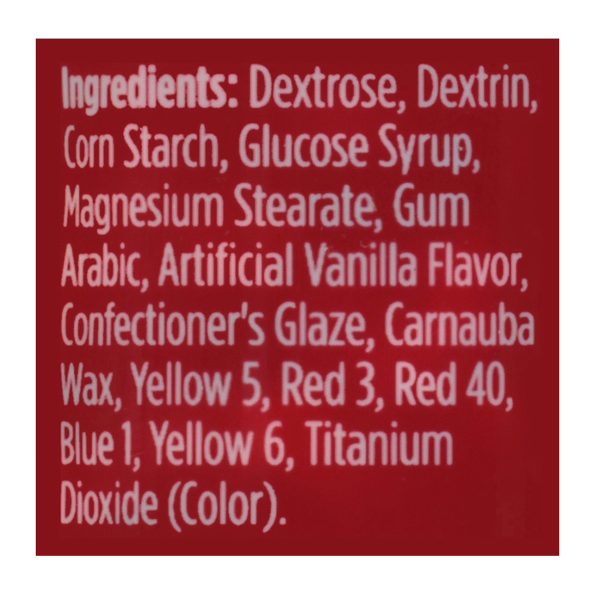 Dextrose, Dextrin, Corn Starch, Glucose Syrup, 2% or Less of: Magnesium Stearate, Gum Arabic, Artificial Flavor, Confectioner's Glaze, Carnauba Wax, Yellow 5, Red 3, Red 40, Blue 1, Yellow 6, Titanium…