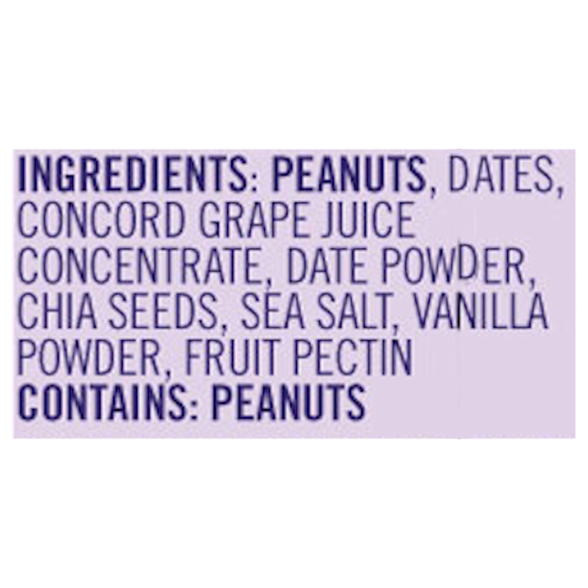 Peanuts, Dates, Concord Grape Juice Concentrate, Date Powder, Chia Seeds, Sea Salt, Vanilla Powder, Fruit Pectin.