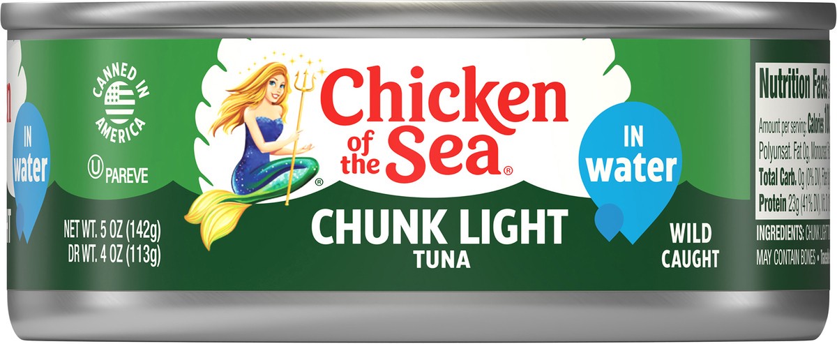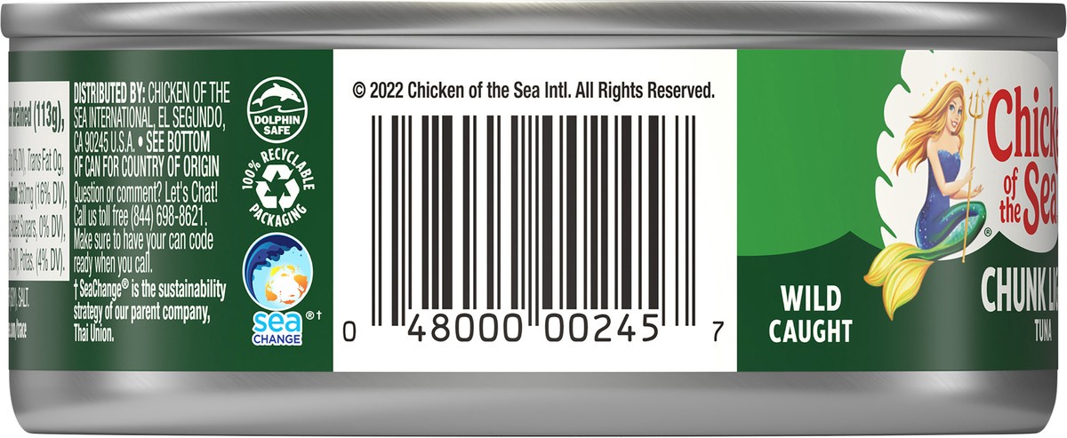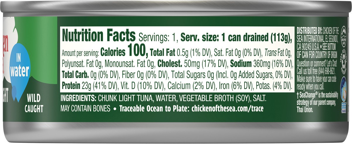 Wild caught. Dolphin safe. Traceable Ocean to Plate: chickenofthesea.com/trace. SeaChange (SeaChange is the sustainability strategy of our parent company, Thai Union.