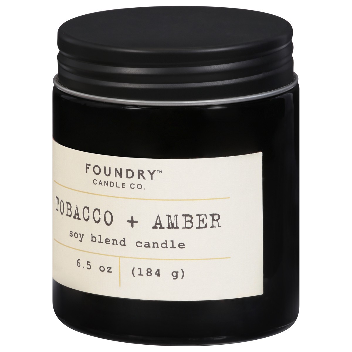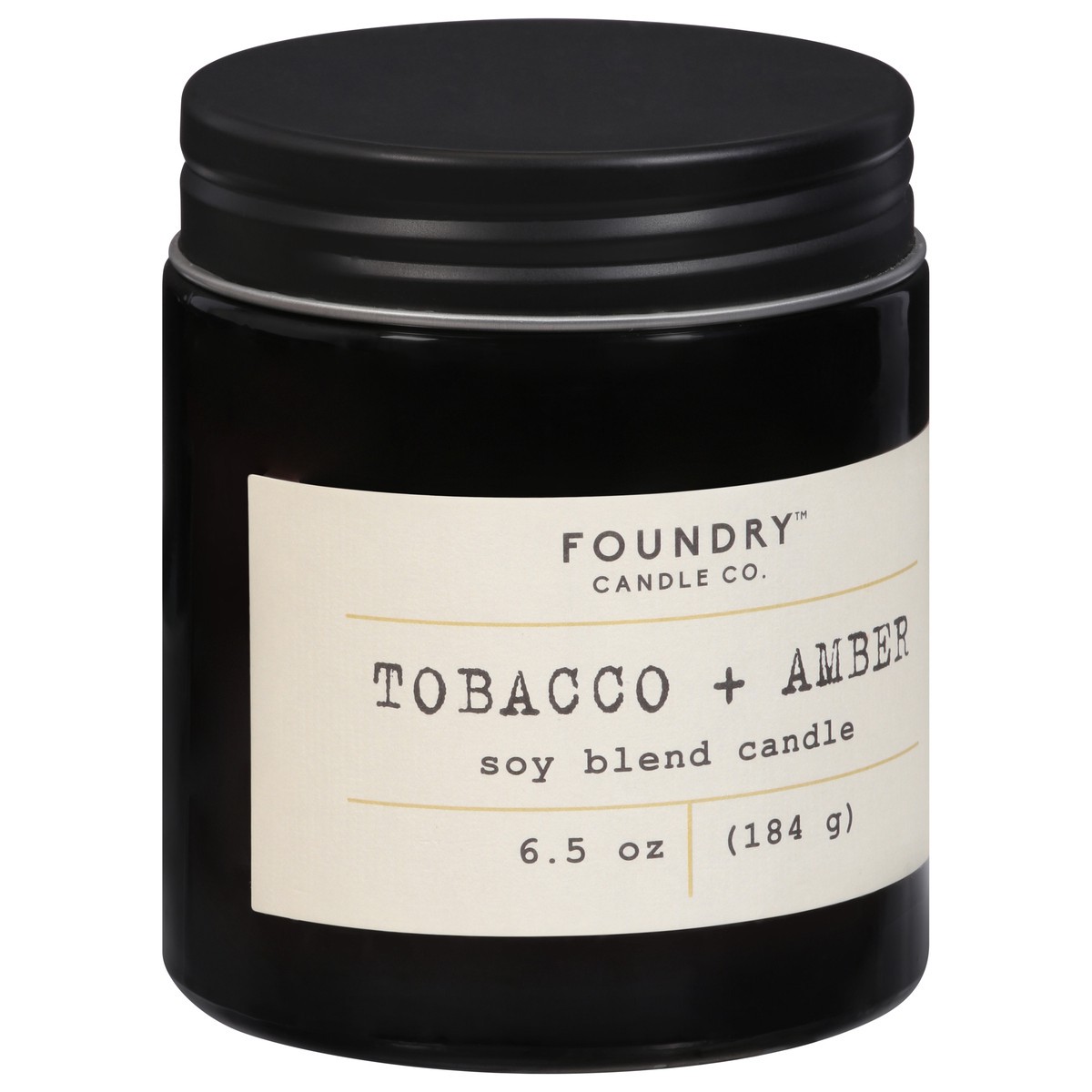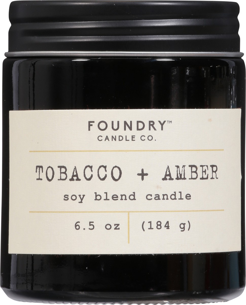 Foundry's Tobacco + Amber 6.5 oz. soy-wax blended candle with a cotton wick features fragrance notes of tobacco, patchouli, and smoke. Our transparent black glass jar with a screw on matte black lid i…