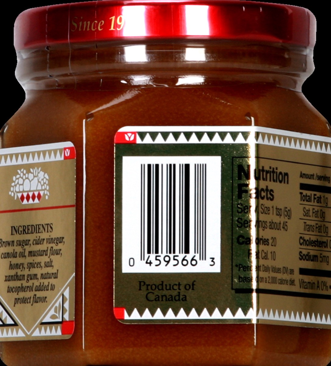 Brown Sugar, Cider Vinegar, Canola Oil, Mustard Flour, Honey, Spices, Salt, Xanthan Gum, Natural Tocopherol Added to Protect Flavor.