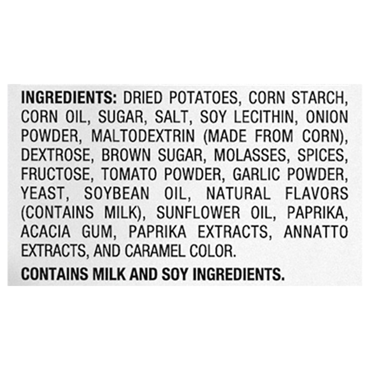 Dried Potatoes, Corn Starch, Corn Oil, Sugar, Salt, Soy Lecithin, Onion Powder, Maltodextrin (Made from Corn), Dextrose, Brown Sugar, Molasses, Spices, Fructose, Tomato Powder, Garlic Powder, Yeast, S…