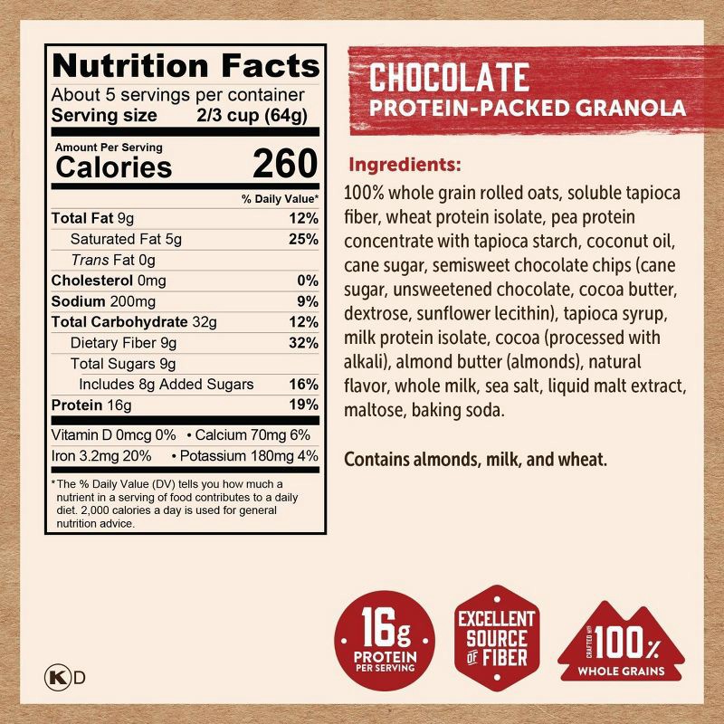 100% Whole Grain Rolled Oats, Soluble Tapioca Fiber, Wheat Protein Isolate, Pea Protein Concentrate with Tapioca Starch, Coconut Oil, Cane Sugar, Semisweet Chocolate Chips (Cane Sugar, Unsweetened Cho…