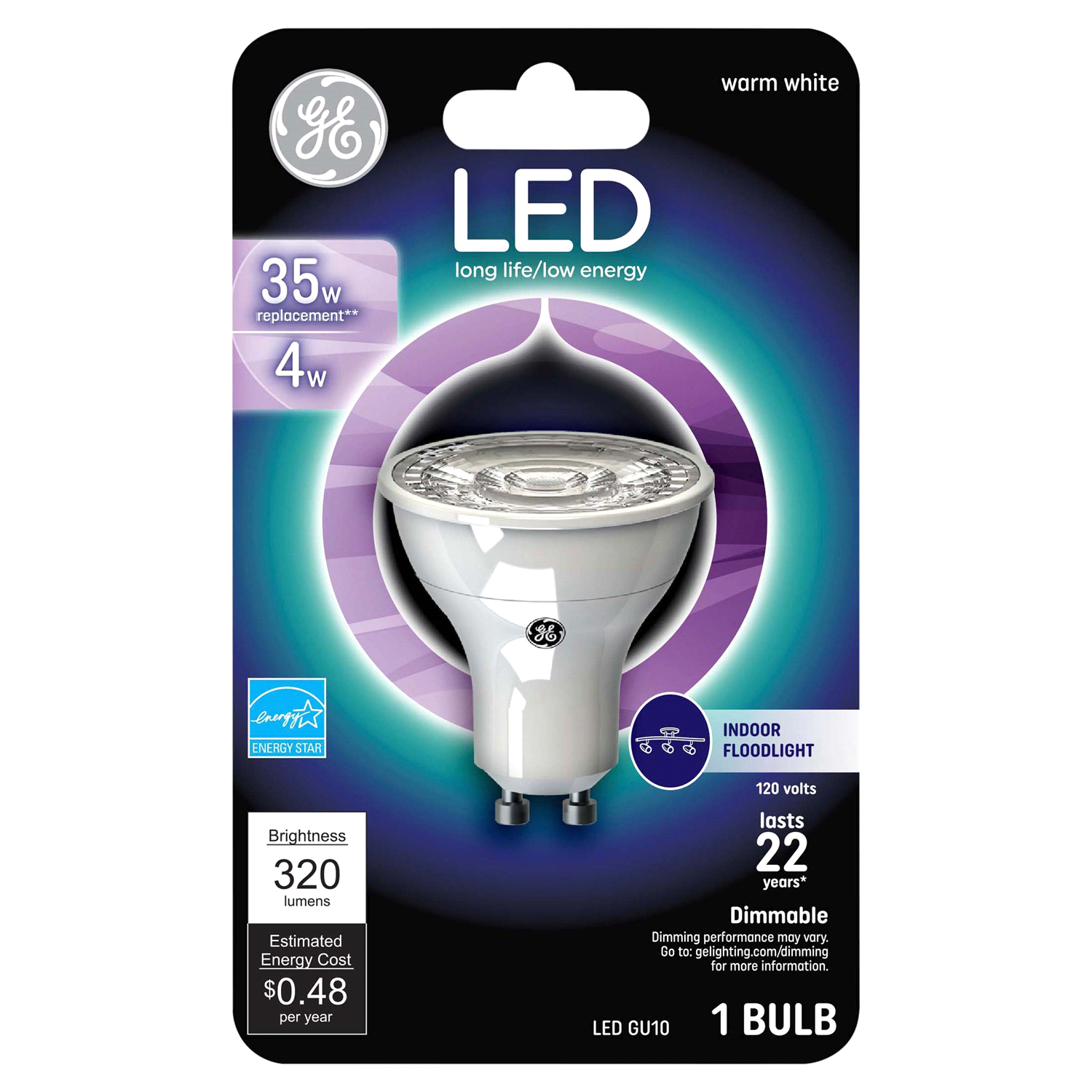 Brightness Quantity: 320 lumens. Energy Info: $0.48 Based on 3 hrs/day, 11 cents/kWh. Cost depends on rates and use. 4 watts. Package Info: 1. Voltage: 120 V. Bulb Info: Indoor. LED. Is Dimmable. Is F…