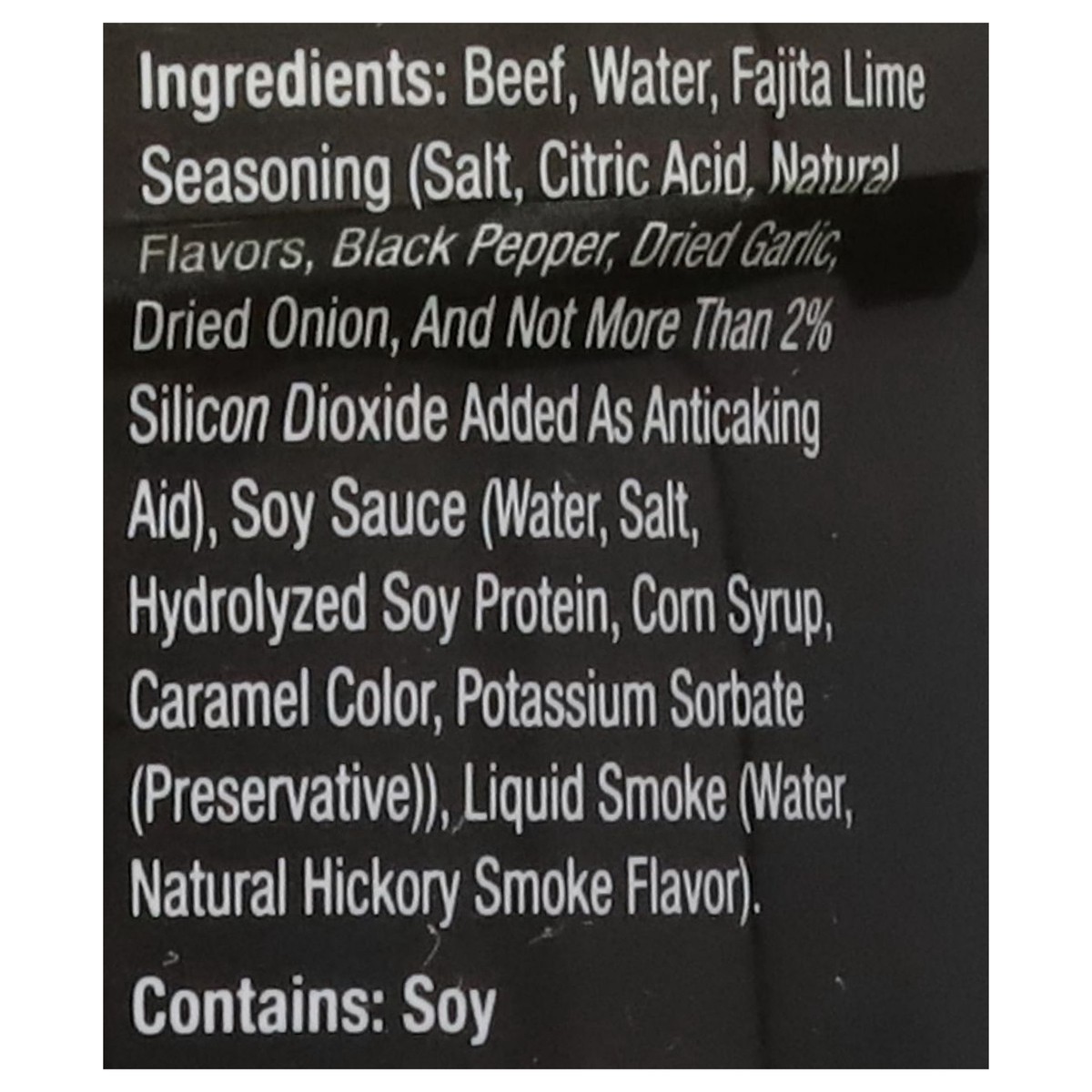 Beef, Water, Fajita Lime Seasoning (Salt, Citric Acid, Natural Flavors, Black Pepper, Dried Garlic, Dried Onion, and Not More than 2% Silicon Dioxide Added as Anticaking Aid), Soy Sauce (Water, Salt, …