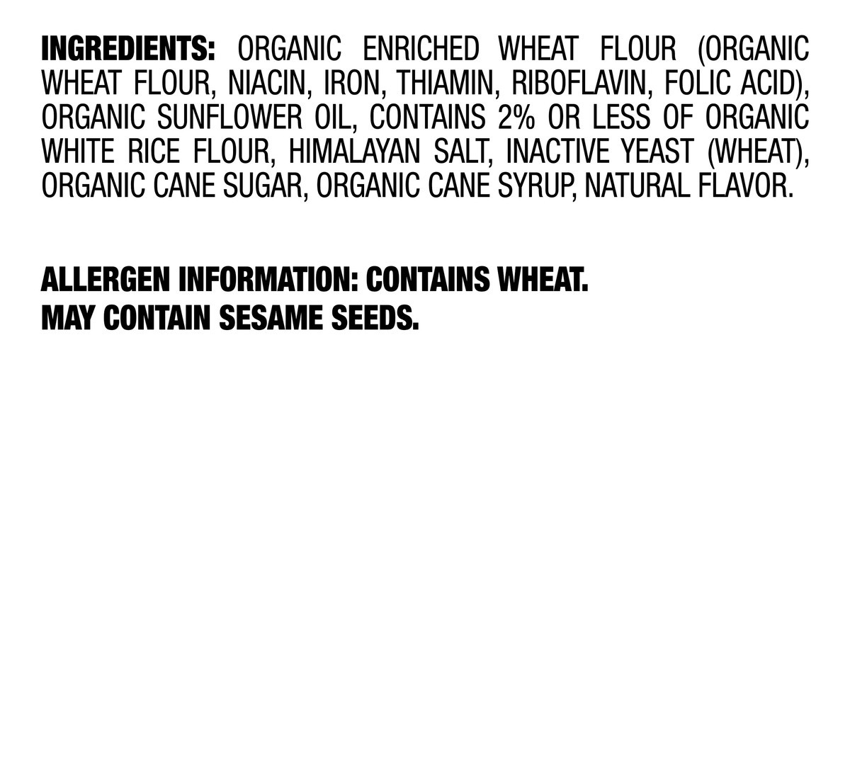 Organic Enriched Wheat Flour (Organic Wheat Flour, Niacin, Iron, Thiamin, Riboflavin, Folic Acid), Organic Sunflower Oil, Contains 2% Or Less Of Organic White Rice Flour, Himalayan Salt, Inactive Yeas…