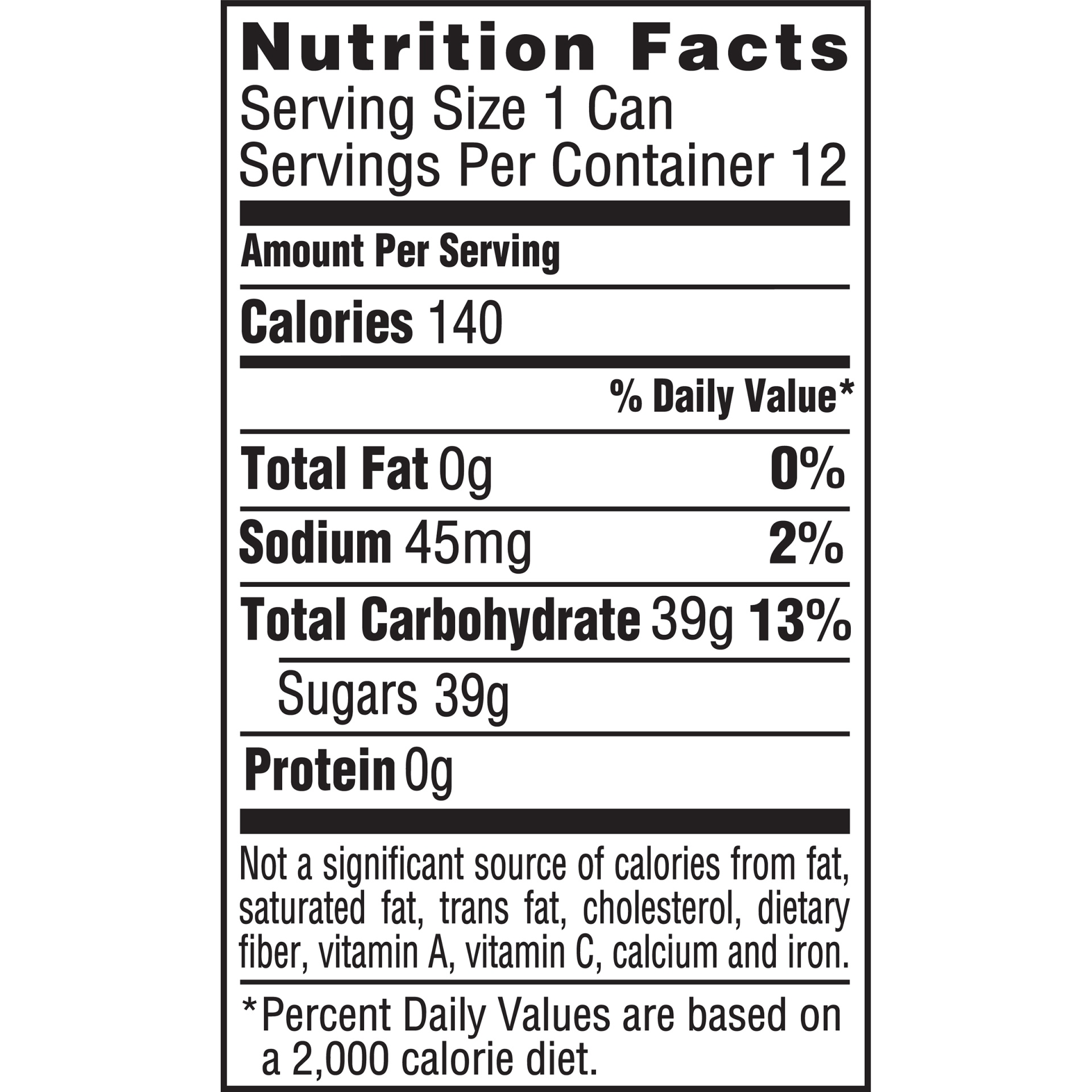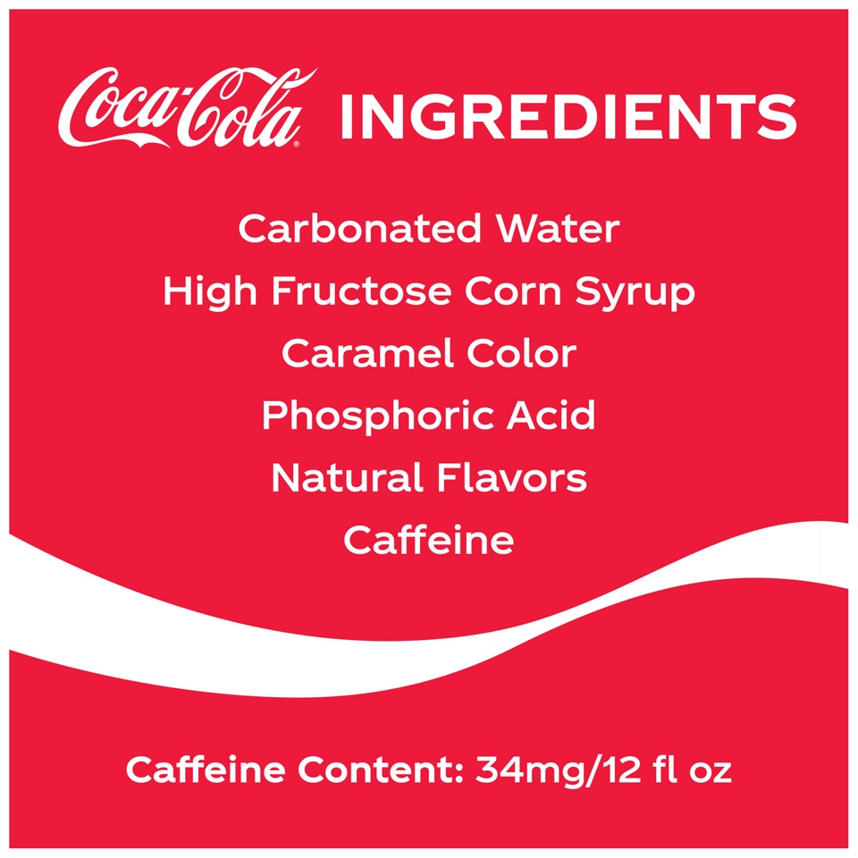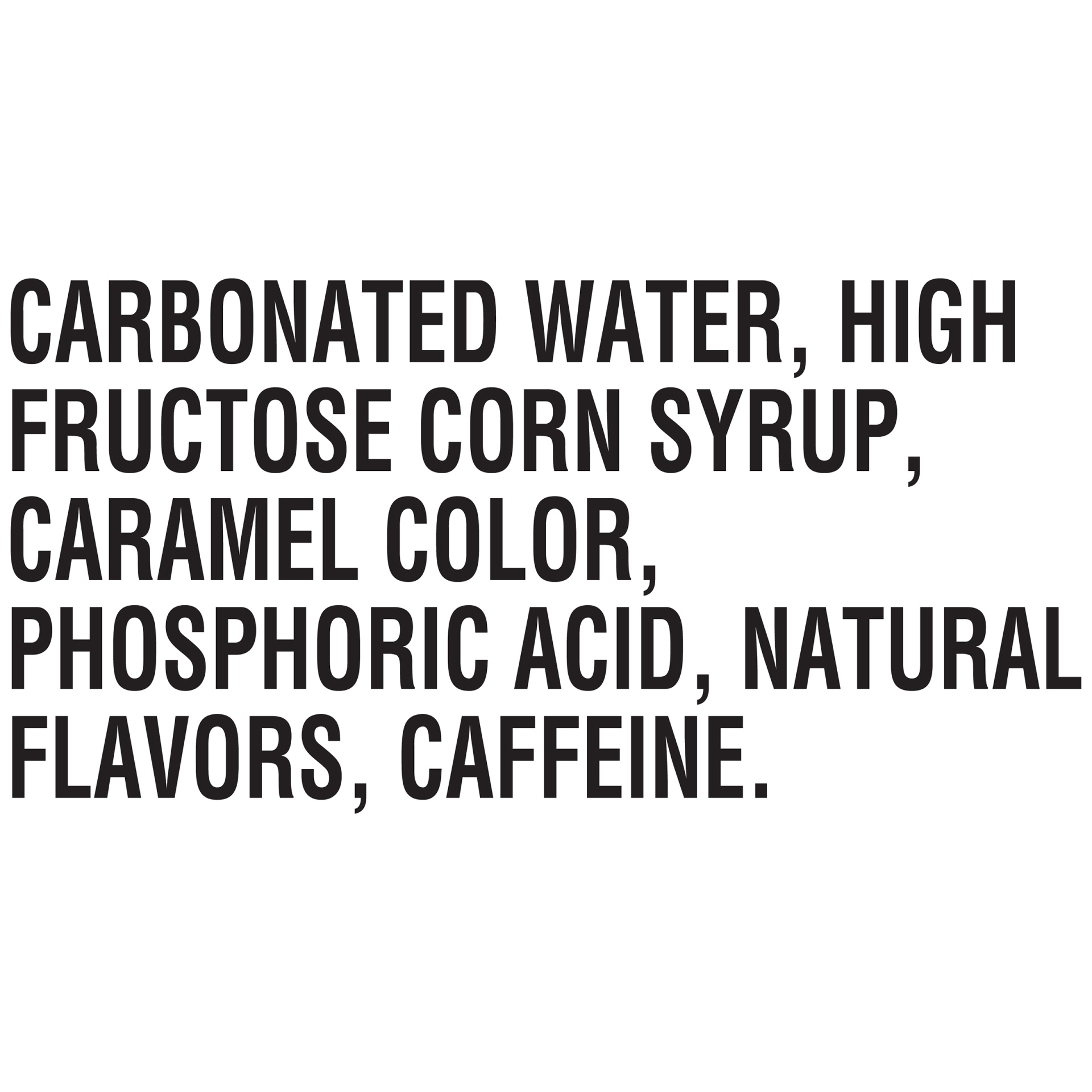 INGREDIENTS: CARBONATED WATER, HIGH FRUCTOSE CORN SYRUP, CARAMEL COLOR, PHOSPHORIC ACID, NATURAL FLAVORS, CAFFEINE.