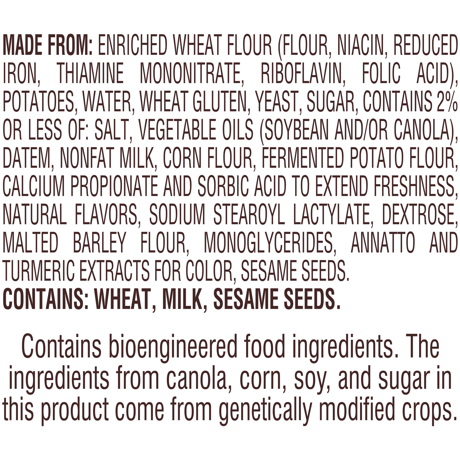 MADE FROM: ENRICHED WHEAT FLOUR (FLOUR, NIACIN, REDUCED IRON, THIAMINE MONONITRATE, RIBOFLAVIN, FOLIC ACID), POTATOES, WATER, WHEAT GLUTEN, YEAST, SUGAR, CONTAINS 2% OR LESS OF: SALT, VEGETABLE OILS (…