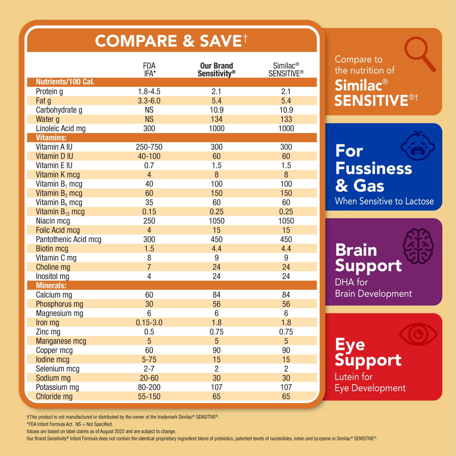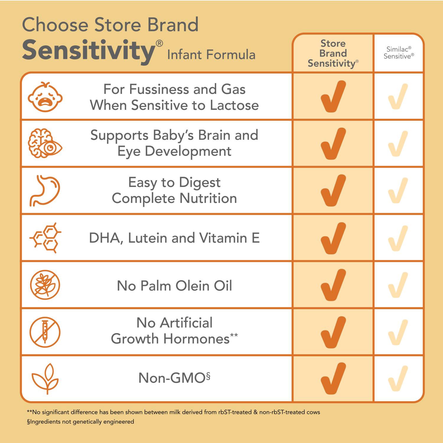 Compare to the nutrition of Similac Sensitive. For fussiness and gas when sensitive to lactose. Sensitivity Infant Formula Milk-Based Powder with Iron is easy to digest and provides complete nutrition…