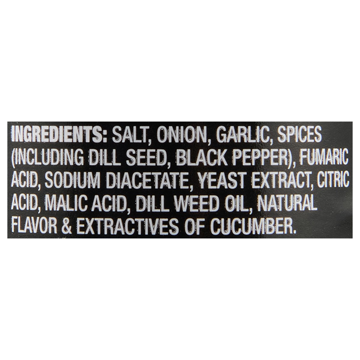 Salt\, Onion\, Garlic\, Spices (Including Dill Seed\, Black Pepper)\, Fumaric Acid\, Sodium Diacetate\, Yeast Extract\, Citric Acid\, Malic Acid\, Dill Weed Oil\, Natural Flavor & Extractives of Cucum…