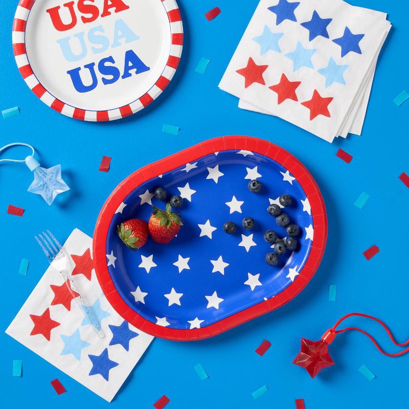 Set up your table with these 10ct 4th of July USA Star Buffet Paper Plates Blue from Spritz™. Designed in a classic oval shape, they work well for serving a variety of meals. The paper construction ma…