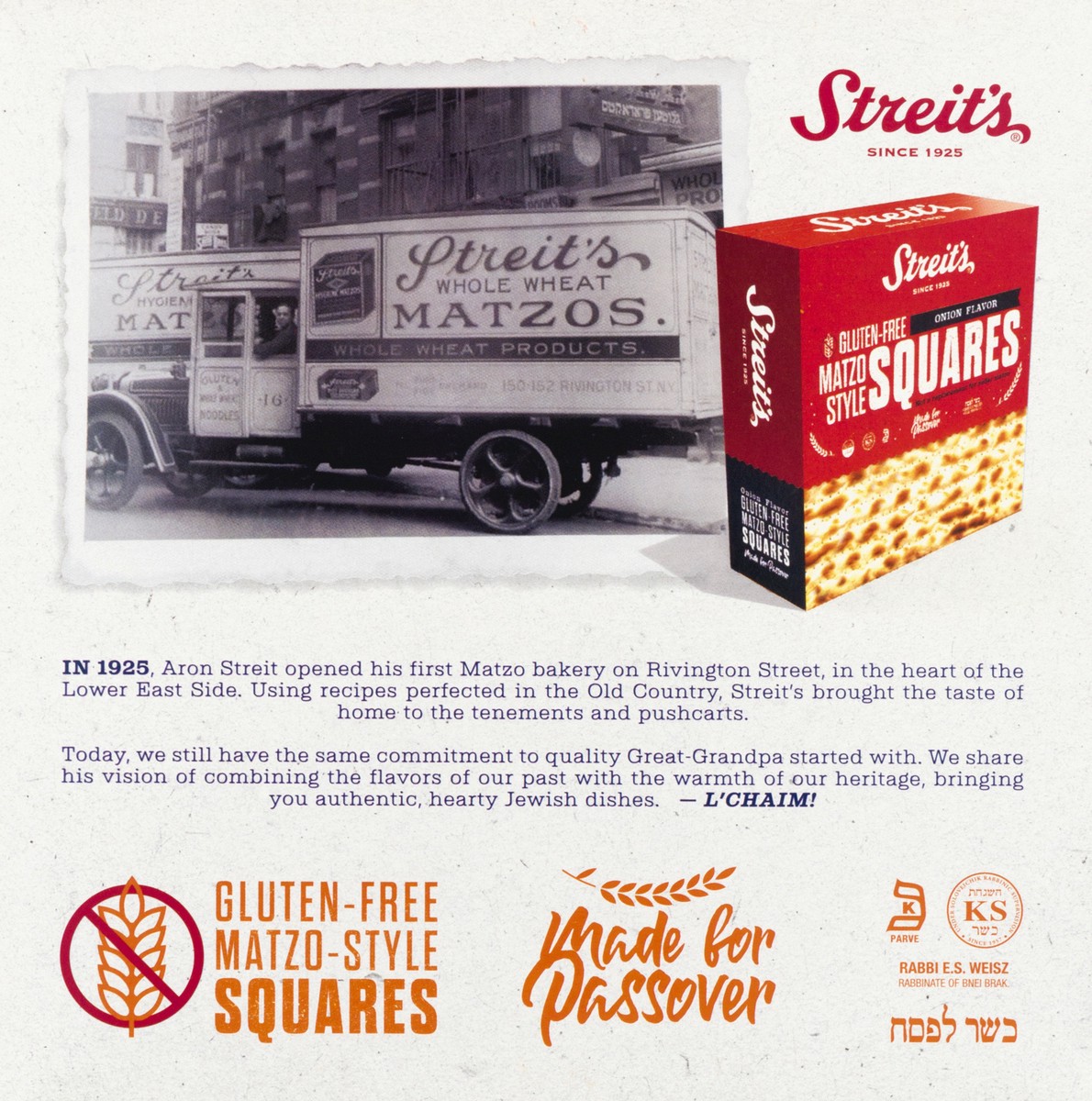 Not a replacement for seder matzo. Gluten-free. Since 1925. Not a replacement for seder matzo. In 1925, Aron Streit opened his first Matzo bakery on Rivington Street, in the heart of the Lower East Si…