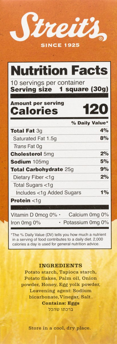Potato Starch, Tapioca Starch, Potato Flakes, Palm Oil, Onion Powder, Honey, Egg Yolk Powder, Leavening Agent: Sodium Bicarbonate, Vinegar, Salt.