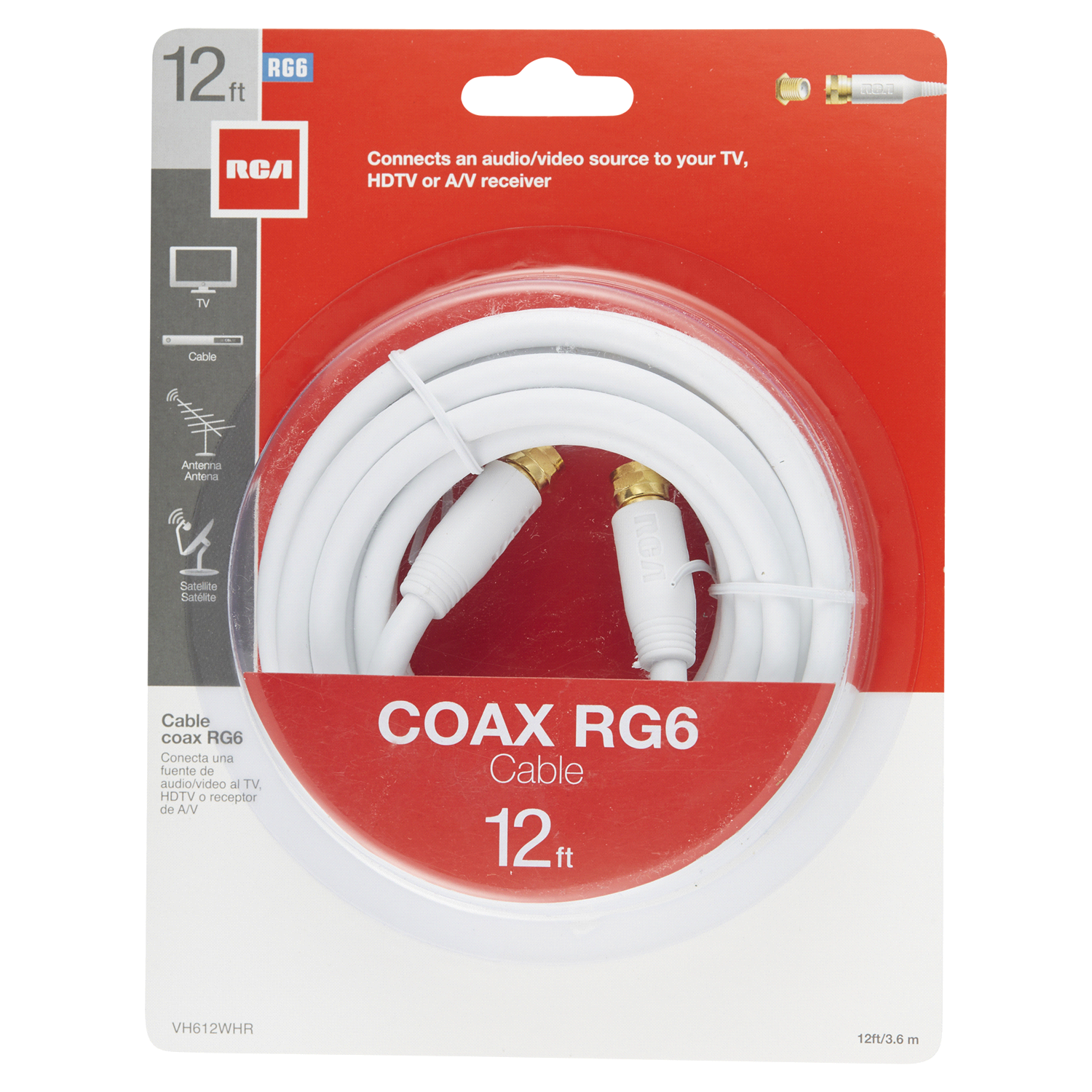 12 ft. white RG6 coax cable made for connecting an audio/video source to your TV, HDTV, or A/V receiver