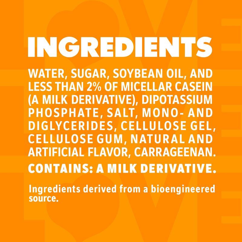 Water, Sugar, Soybean Oil, and Less than 2% of Micellar Casein (a Milk Derivative), Dipotassium Phosphate, Salt, Mono-and Diglycerides, Cellulose Gel, Cellulose Gum, Natural and Artificial Flavor, Car…