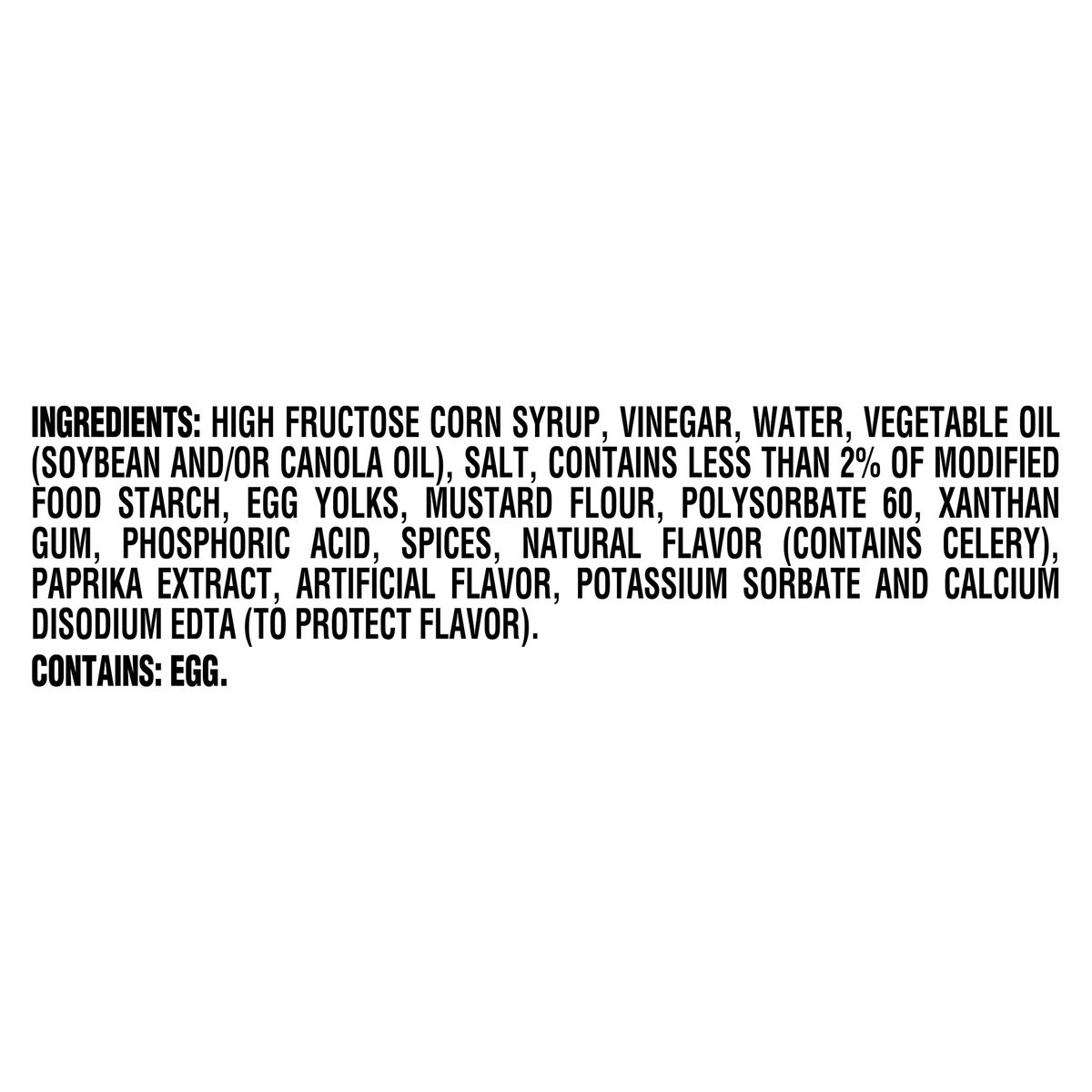 HIGH FRUCTOSE CORN SYRUP, VINEGAR, WATER, SOYBEAN OIL, SALT, CONTAINS LESS THAN 2% OF MODIFIED FOOD STARCH, EGG YOLKS, MUSTARD FLOUR, POLYSORBATE 60, XANTHAN GUM, PHOSPHORIC ACID, NATURAL FLAVOR, PAPR…
