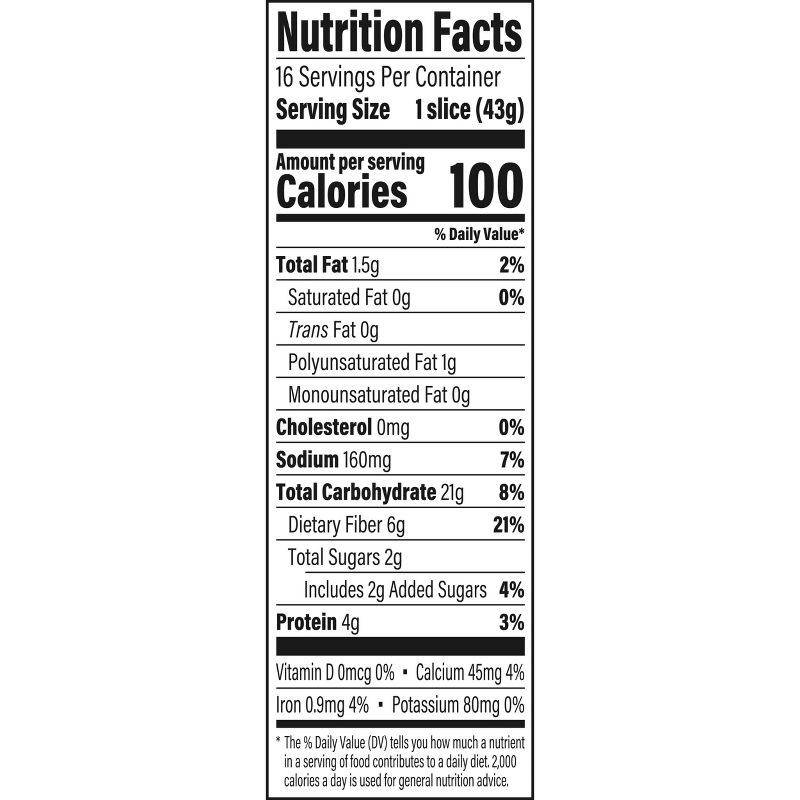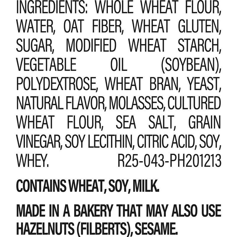Whole Wheat Flour, Water, Oat Fiber, Wheat Gluten, Sugar, Modified Wheat Starch, Vegetable Oil (Soybean), Polydextrose, Wheat Bran, Yeast, Natural Flavor, Molasses, Cultured Wheat Flour, Sea Salt, Gra…