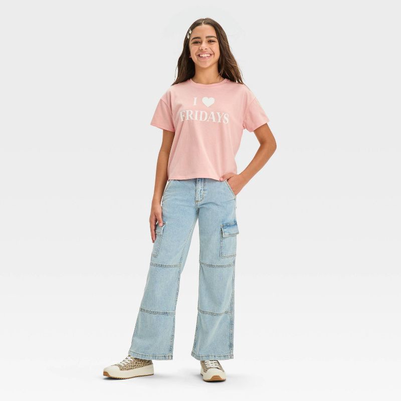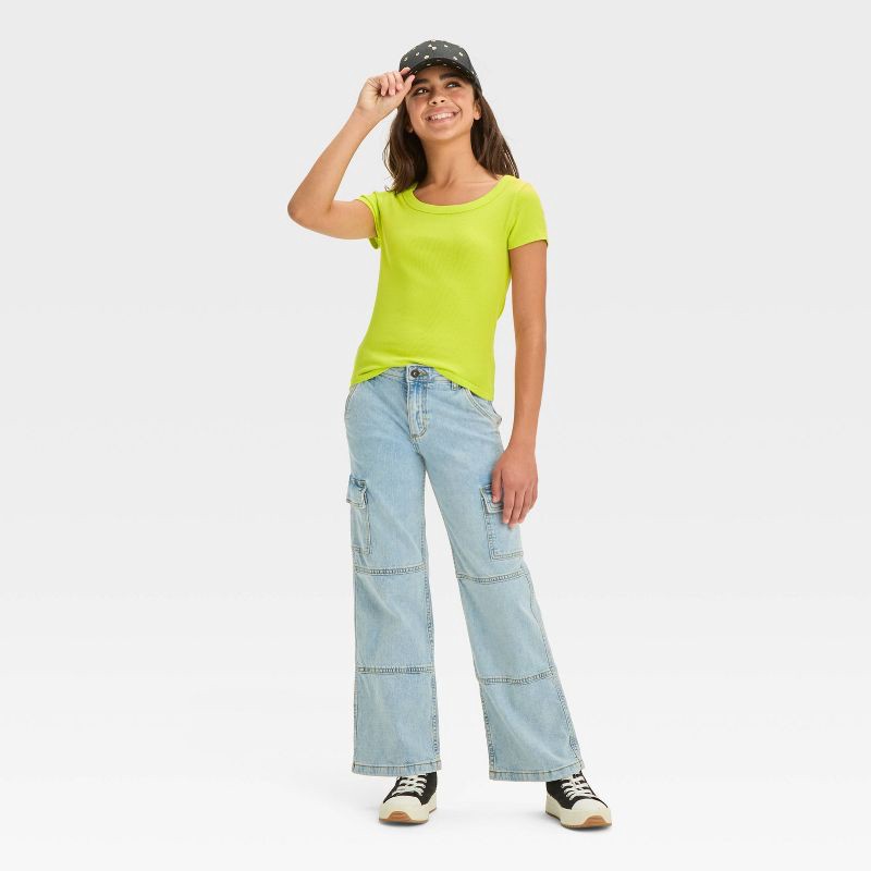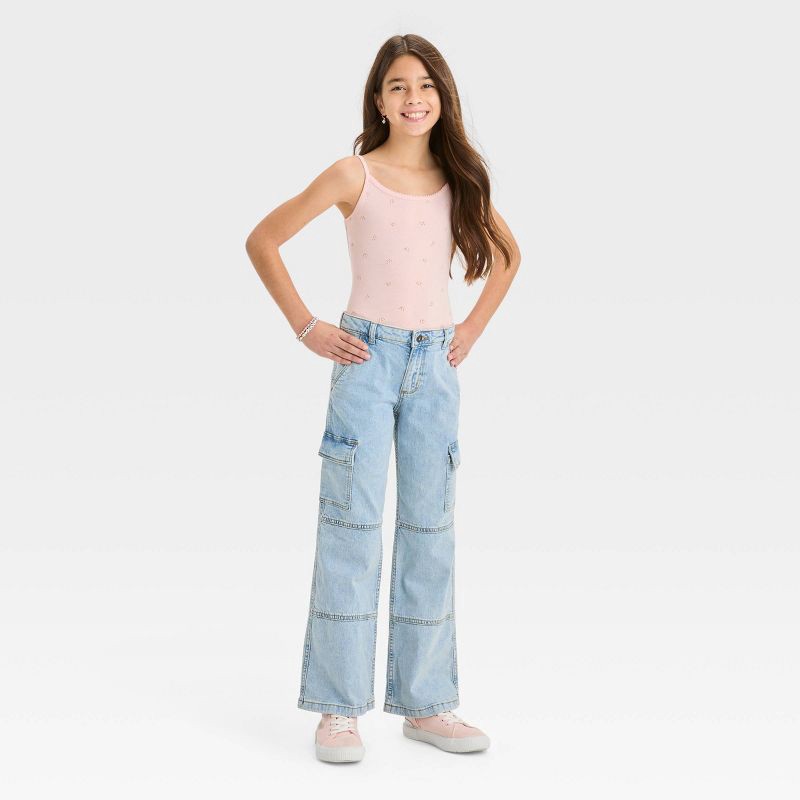 Spruce up your child's casual wardrobe with these Cargo Mid-Rise Wide Leg Jeans from art class™. The cargo jeans are made from midweight cotton fabric with a hint of spandex and a wide-leg straight fi…