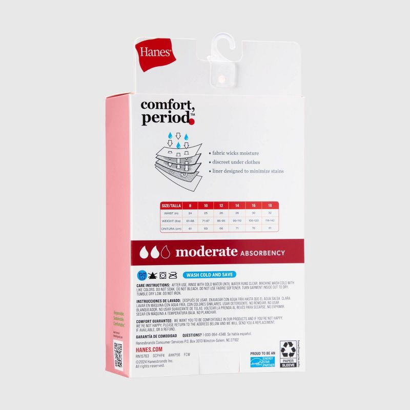CONFIDENCE. ALL DAY, EVERY DAY.Hanes Comfort, Period.™ girls' period hipster underwear is designed to provide her with peace of mind and total comfort. Built-in leak protection liner wicks away moistu…