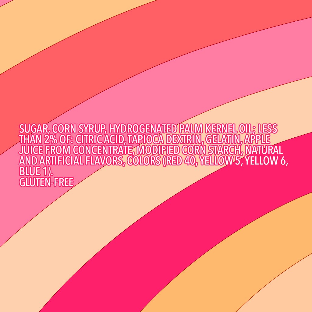 Sugar, Corn Syrup, Hydrogenated Palm Kernel Oil; Less Than 2% Of: Citric Acid, Tapioca Dextrin, Gelatin, Apple Juice From Concentrate, Modified Corn Starch, Natural And Artificial Flavors, Colors (Red…