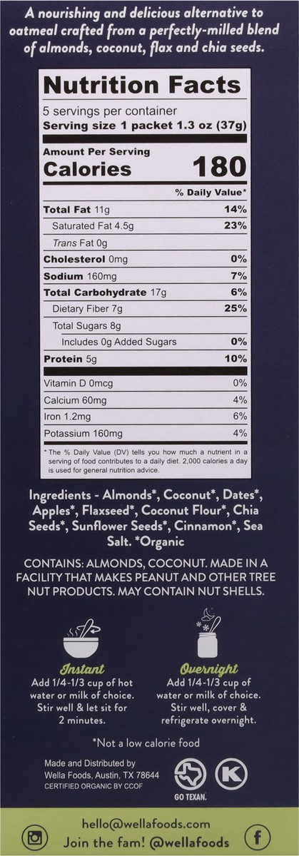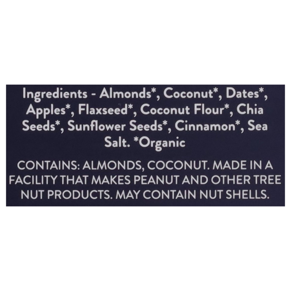Almonds*, Coconut*, Dates*, Apples*, Flaxseed*, Coconut Flour*, Chia Seeds*, Sunflower Seeds*, Cinnamon*, Sea Salt. *Organic.