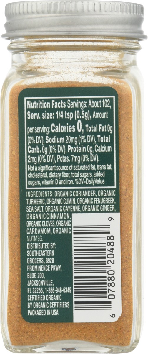 Organic Coriander, Organic Turmeric, Organic Cumin, Organic Fenugreek, Sea Salt, Organic Cayenne, Organic Ginger, Organic Cinnamon, Organic Cloves, Organic Cardamom, Organic Nutmeg.