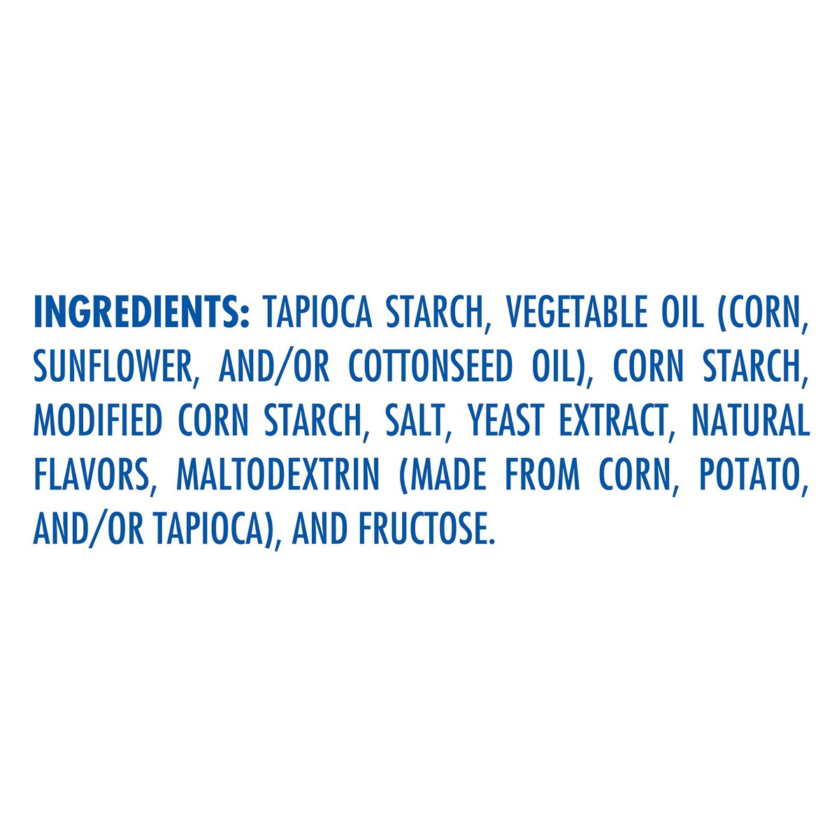 Tapioca Starch, Vegetable Oil (Corn, Sunflower, and/or Cottonseed Oil), Corn Starch, Modified Corn Starch, Salt, Yeast Extract, Natural Flavors, Maltodextrin (Made from Corn, Potato, and/or Tapioca), …