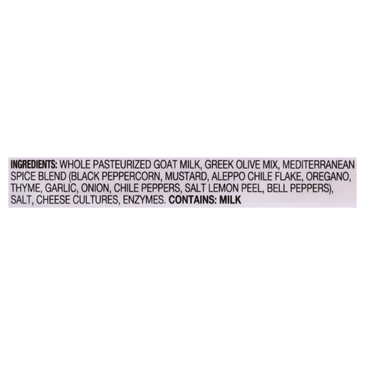 Whole Pasteurized Goat Milk, Greek Olive Mix, Mediterranean Spice Blend (Black Peppercorn, Mustard, Aleppo Chile Flake, Oregano, Thyme, Garlic, Onion, Chile Peppers, Salt Lemon Peel, Bell Peppers), Sa…