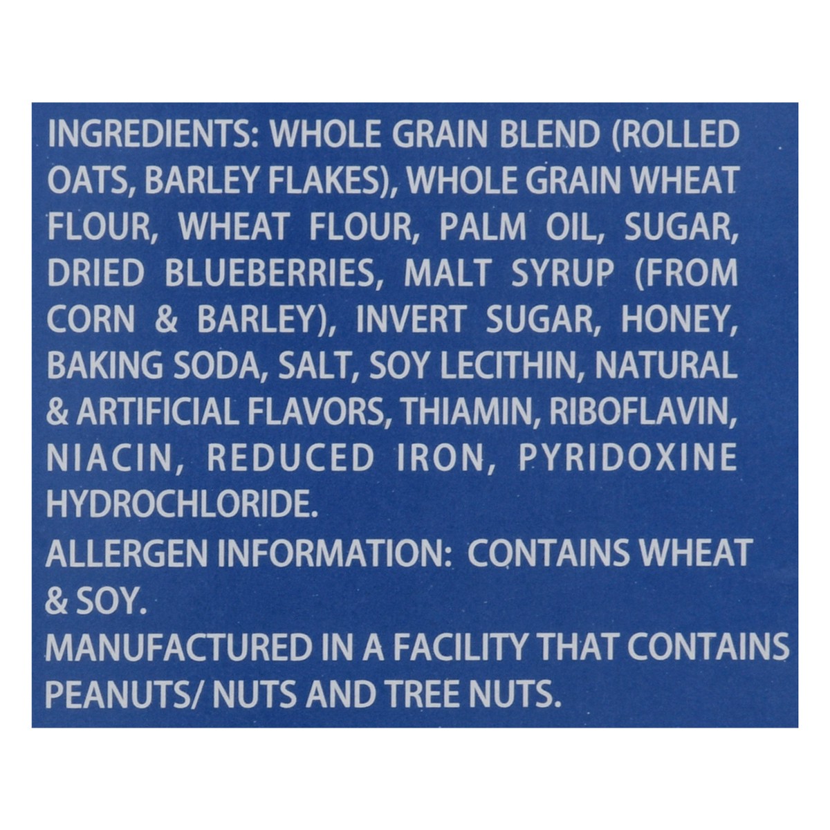 Whole Grain Blend (Rolled Oats, Barley Flakes), Whole Grain Wheat Flour, Wheat Flour, Palm Oil, Sugar, Dried Blueberries, Malt Syrup (from Corn & Barley), Invert Sugar, Honey, Baking Soda, Salt, Soy L…