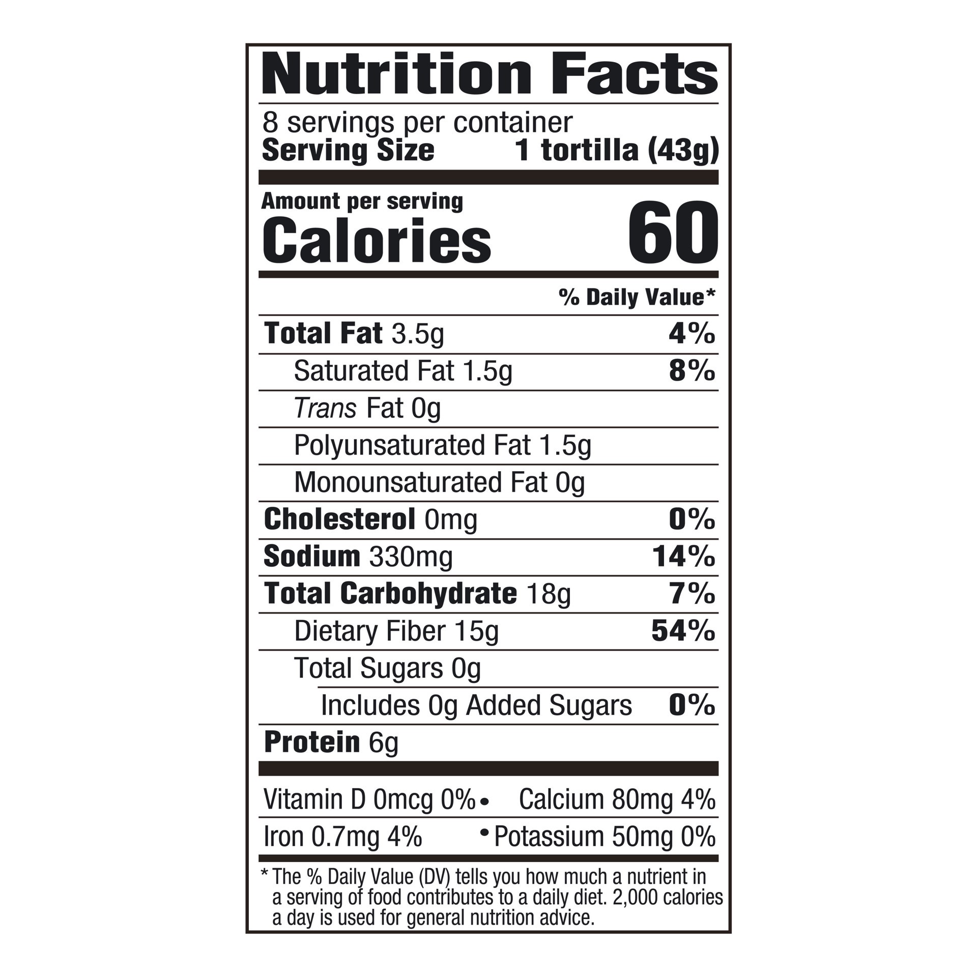 3 g net carbs per tortilla. High fiber. 70 calories per tortilla. Zero trans fat. Zero cholesterol. Zero sugar (not for weight control). New great taste! The authentic tradition. We've added flavorful…