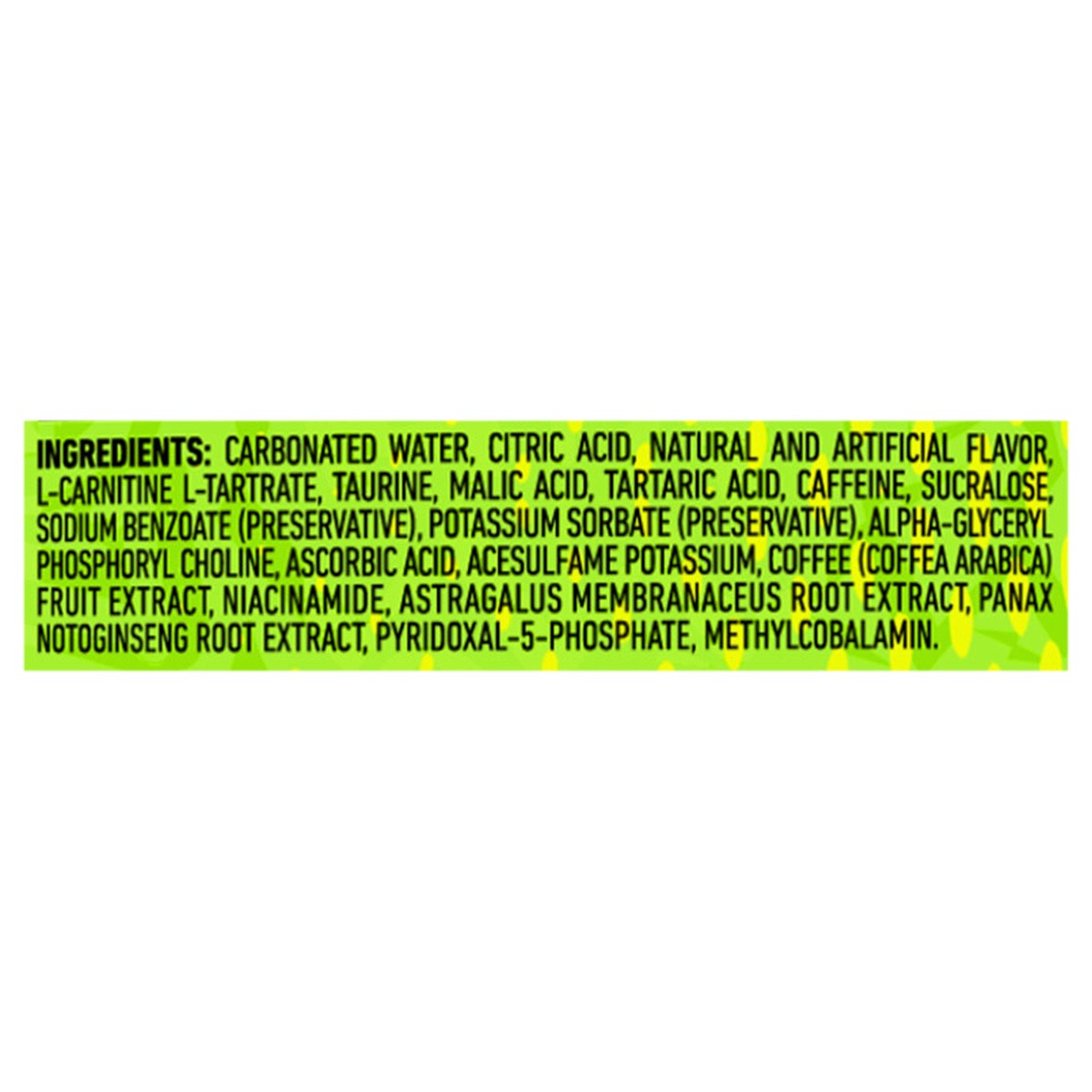 Ghost Energy: Carnipure L-Carnitine L-Tartrate, Taurine, Natural Caffeine(from Coffee (Coffea Spp,) Bean), Alpha-Gpc (Alpha-Glyceryl Phosphoryl Choline 50%), Neurofactortm Coffee (Coffea Arabica) Frui…