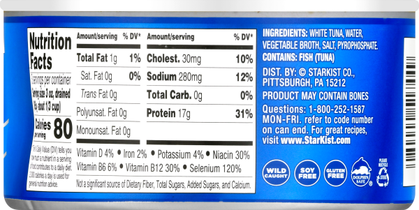 Gluten free. Soy free. www.starkist.com. Question: 1-800-252-1587 Mon-Fri refer to code number on can end. For great recipes, visit www.StarKist.com. Dolphin safe. Wild caught. Please recycle. Packed …