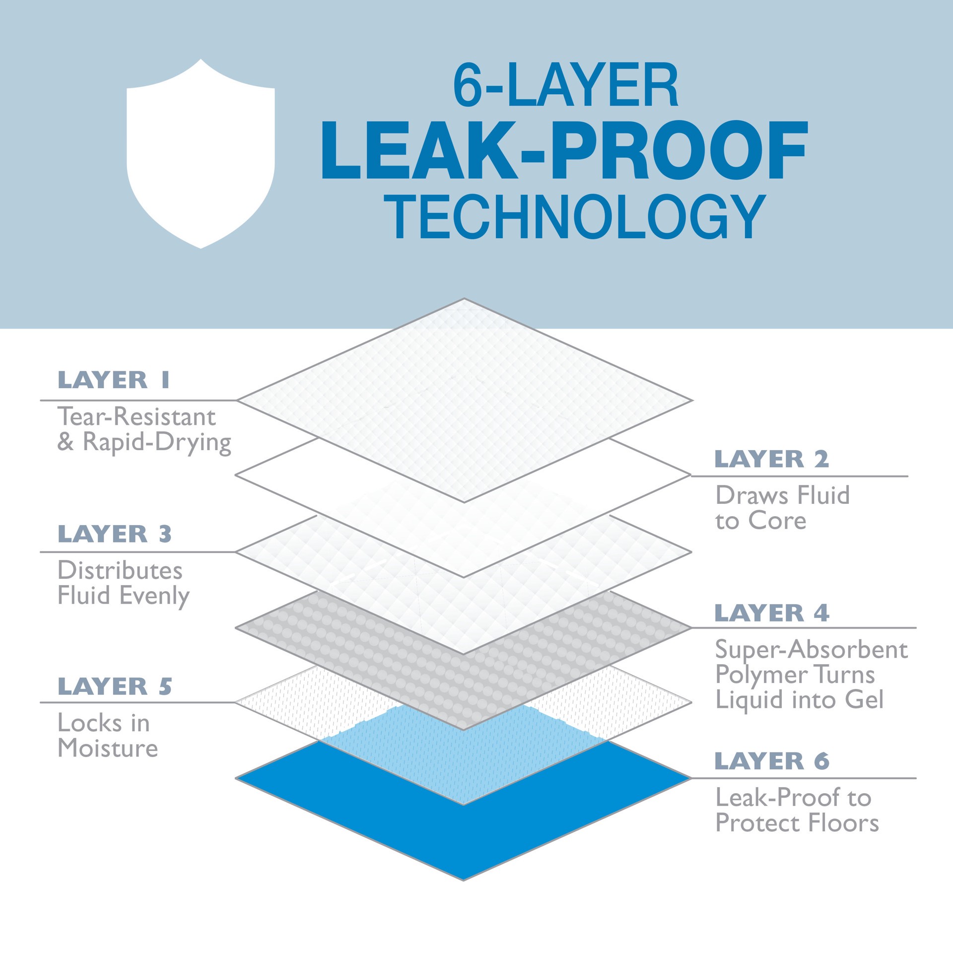 - Exclusive 6-Layer Floor Armor Leak-Proof System draws fluid to the core and locks in moisture