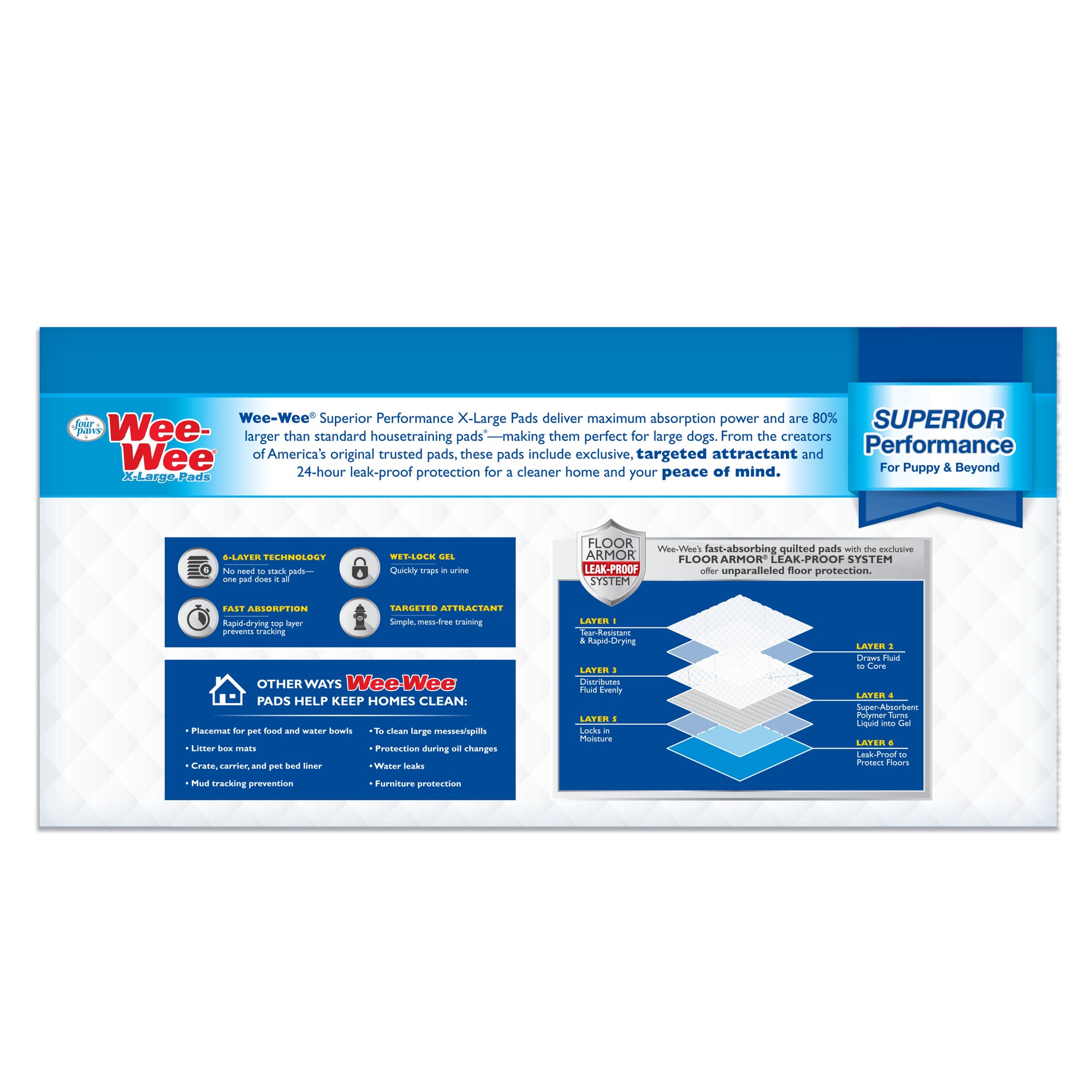 From the creators of America''s Original Trusted Pads, Wee-Wee Superior Performance X-Large Dog Pee Pads are 80% larger and more absorbent than the original 5-layer Wee-Wee Pads! Designed with a 6-lay…
