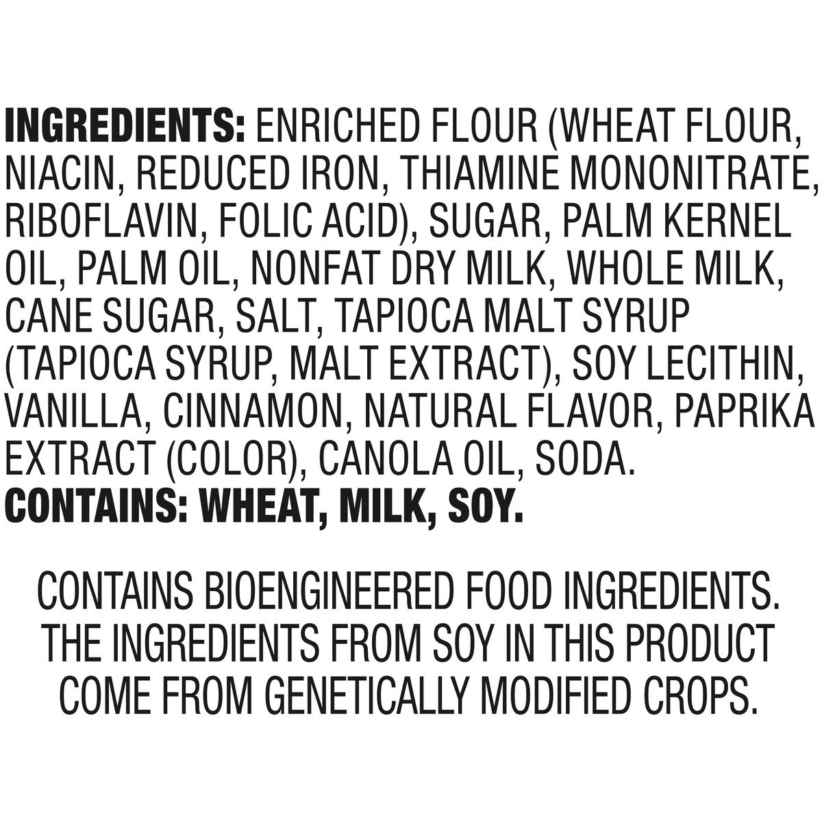 INGREDIENTS: ENRICHED FLOUR (WHEAT FLOUR, NIACIN, REDUCED IRON, THIAMINE MONONITRATE, RIBOFLAVIN, FOLIC ACID), SUGAR, PALM KERNEL OIL, PALM OIL, NONFAT DRY MILK, WHOLE MILK, CANE SUGAR, SALT, TAPIOCA …