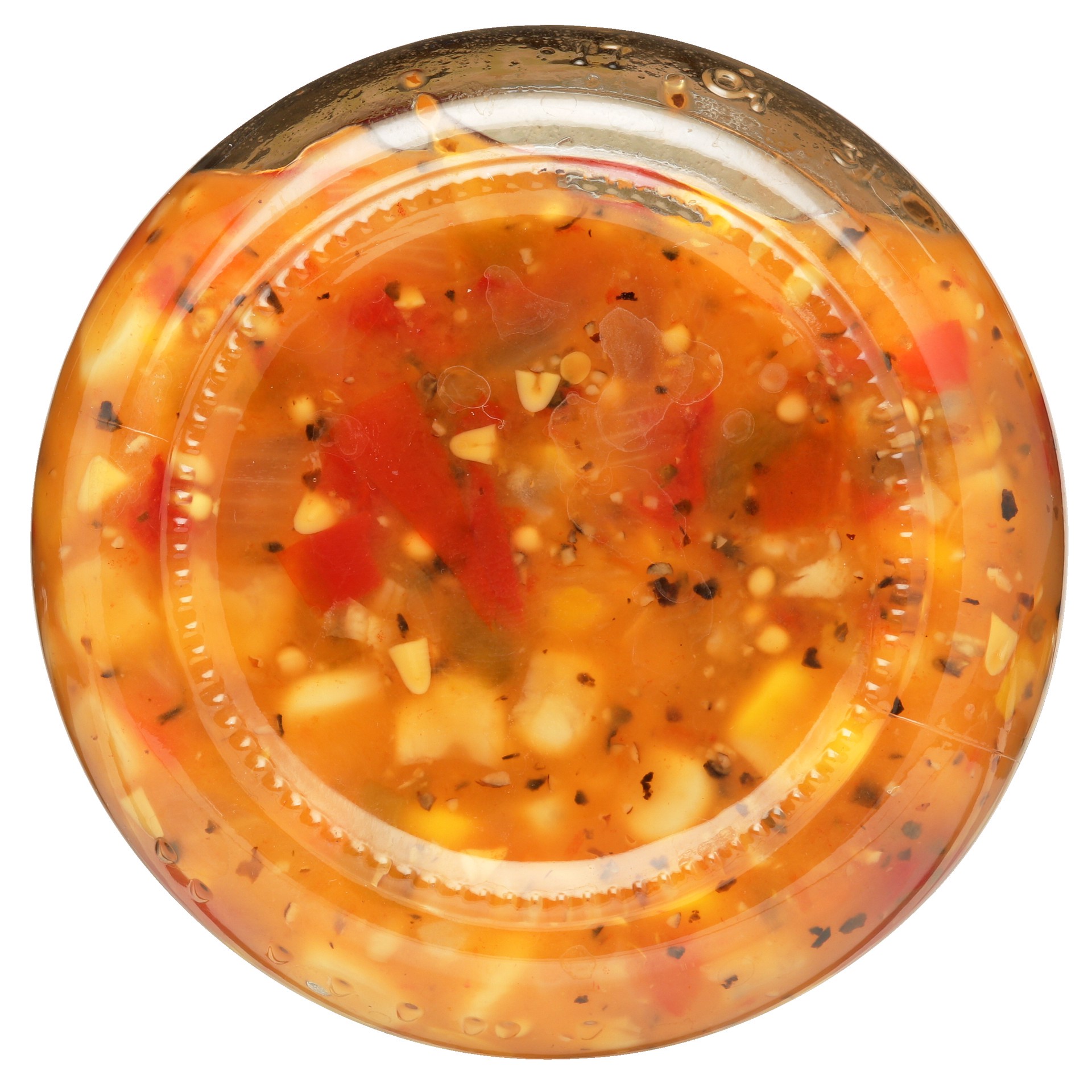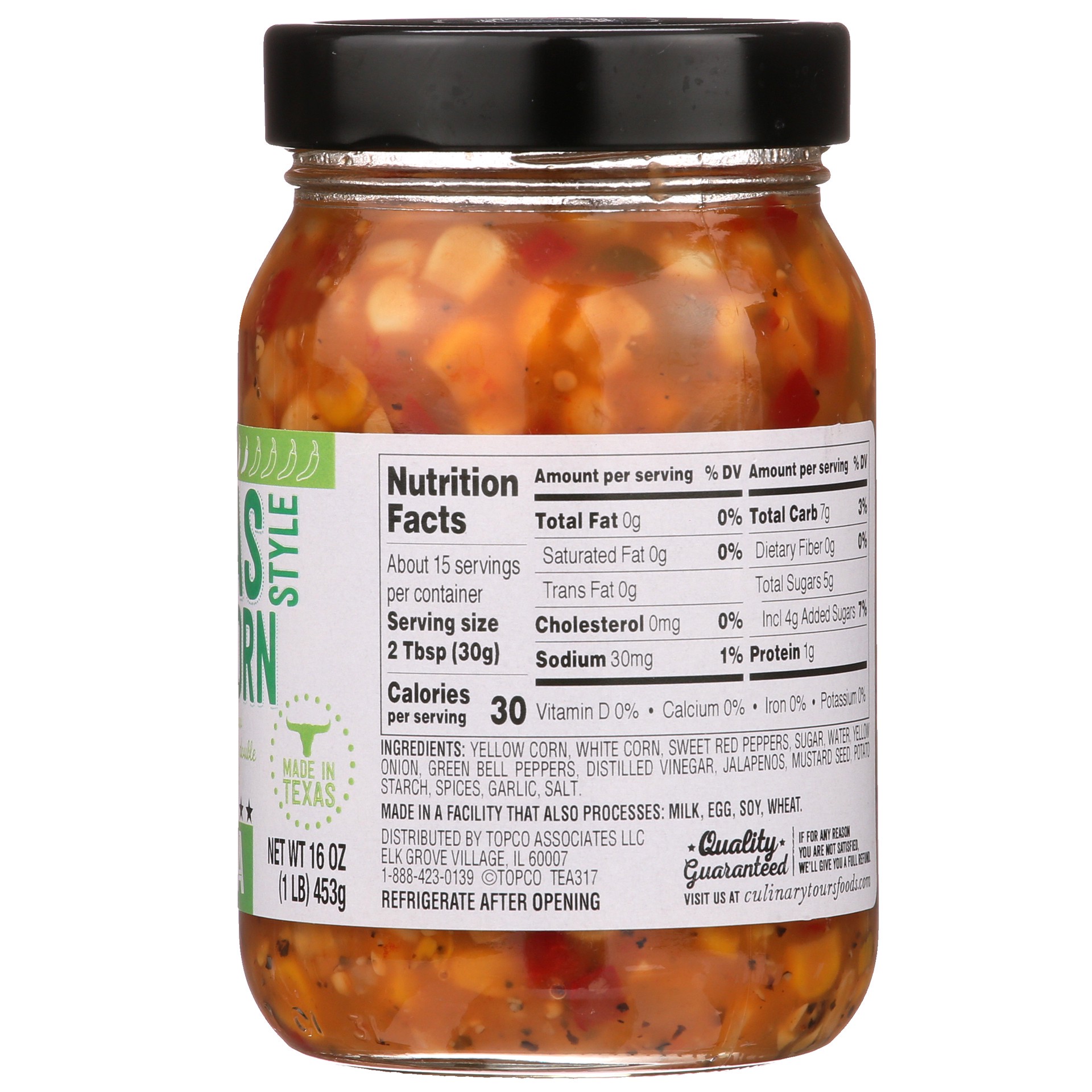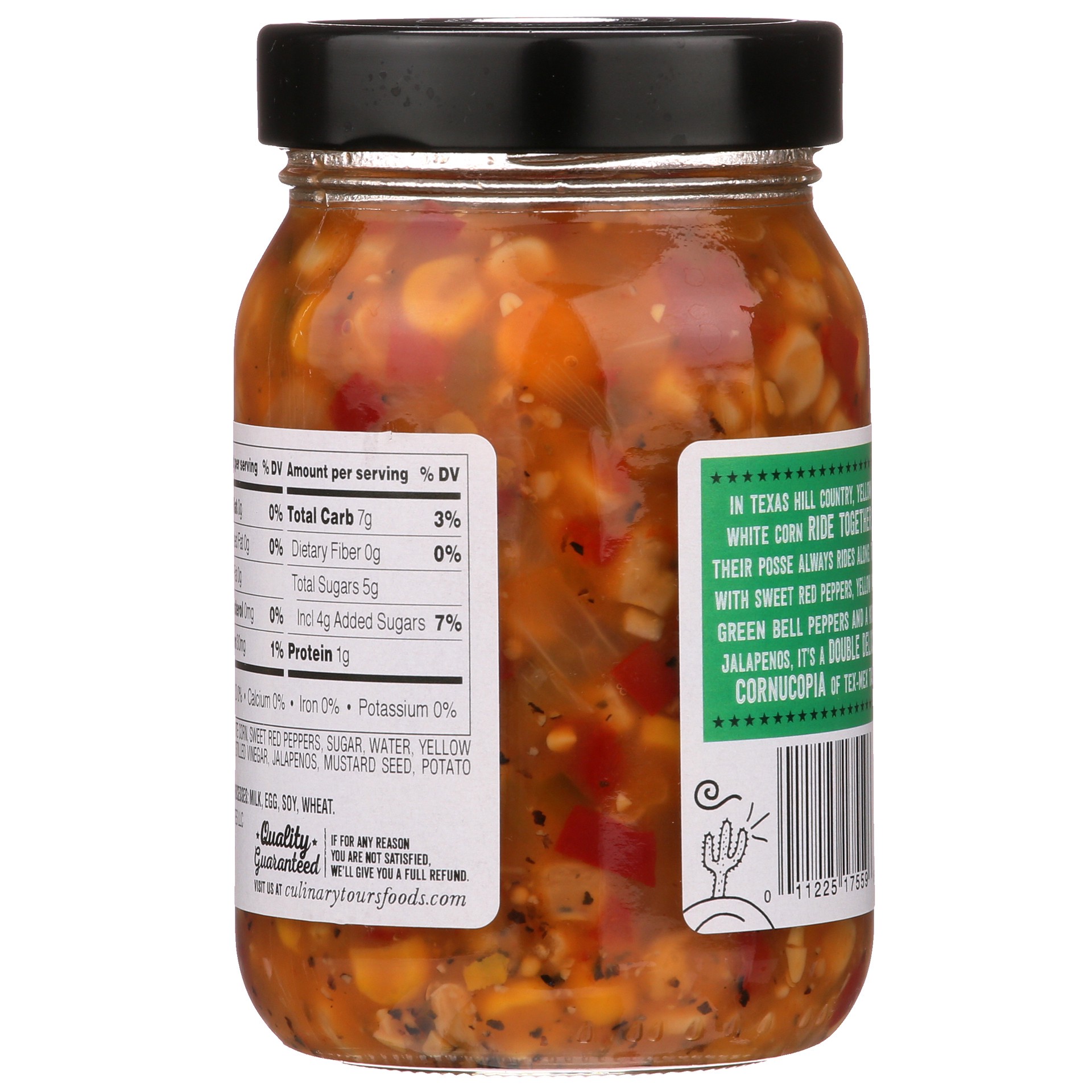 Yellow Corn, White Corn, Sweet Red Peppers, Sugar, Water, Yellow Onion, Green Bell Peppers, Distilled Vinegar, Jalapenos, Mustard Seed, Potato Starch, Spices, Garlic, Salt.