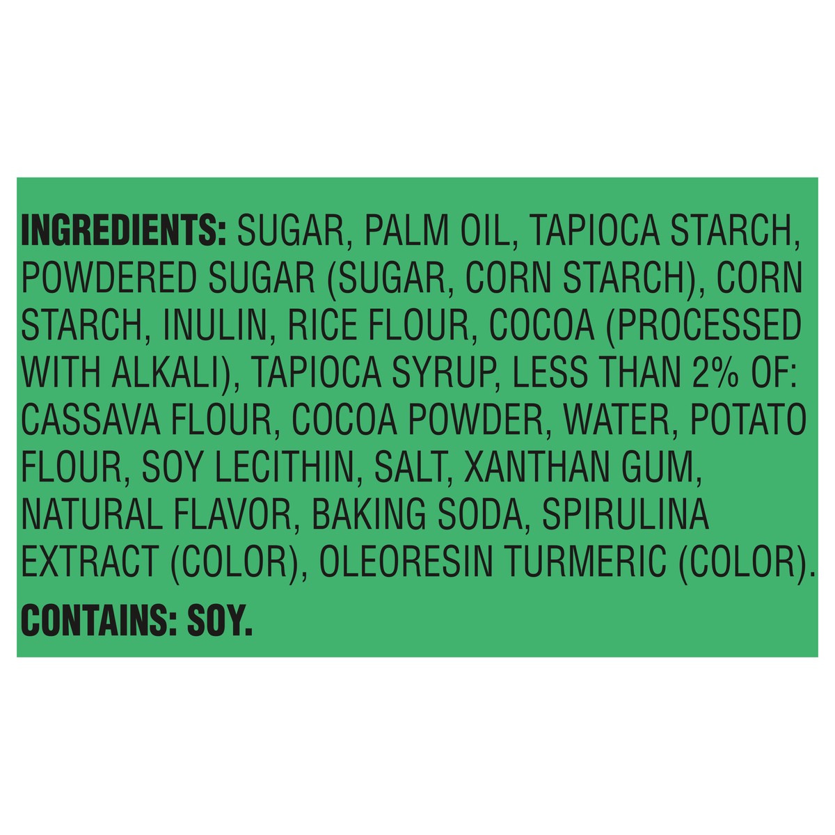 Sugar, Palm Oil, Tapioca Starch, Powdered Sugar (Sugar, Corn Starch), Corn Starch, Inulin, Rice Flour, Cocoa (Processed with Alkali), Tapioca Syrup, Less than 2% of: Cassava Flour, Cocoa Powder, Water…