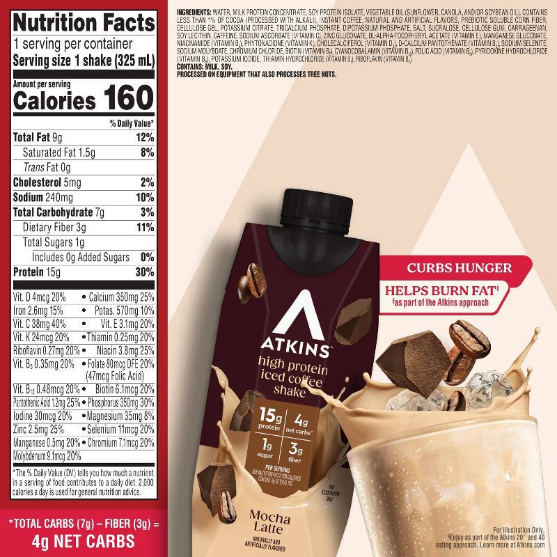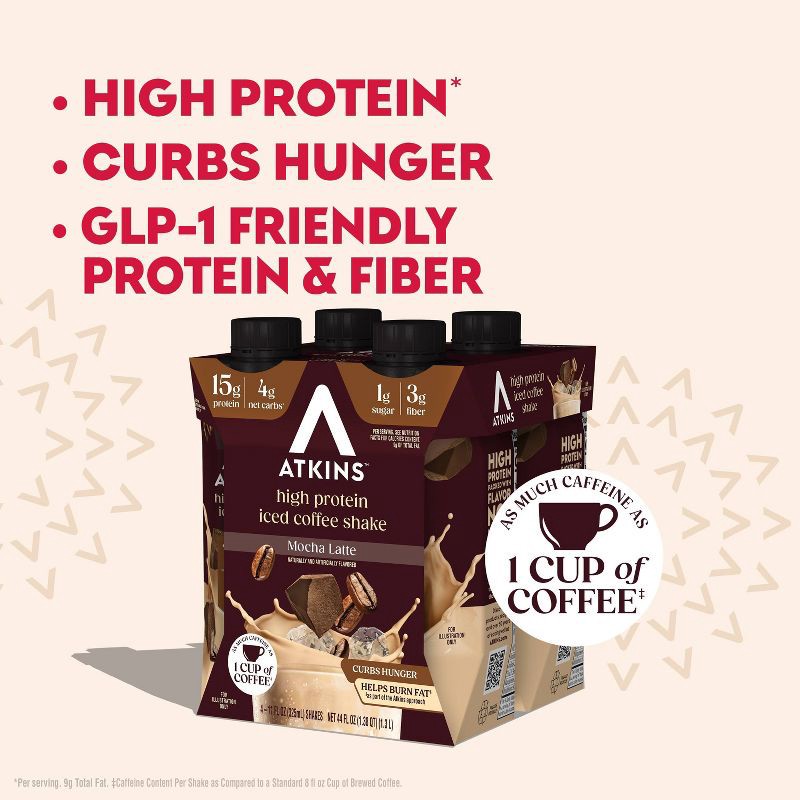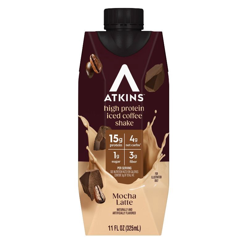 - AT HOME OR ON-THE-GO. Atkins Mocha Latte Iced Coffee Protein Shakes. Enjoy delicious shakes that fit right into your Busy schedule, with 15g of protein, 4g of net carbs, and 1g of sugar per serving*. This is Today's Atkins™.