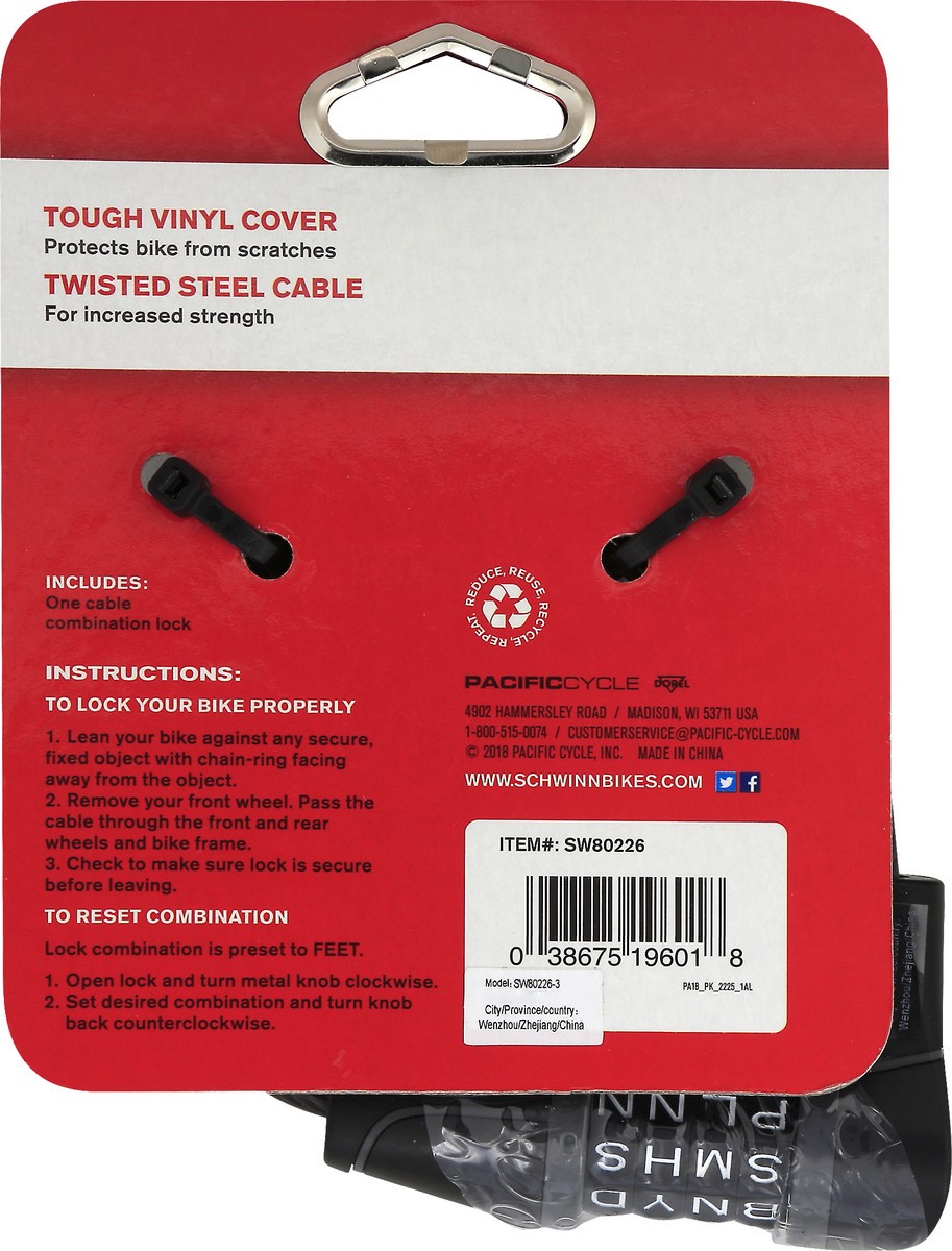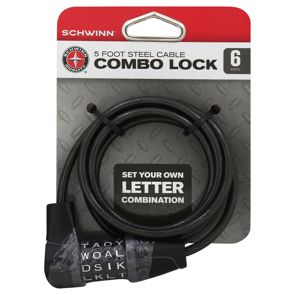 SW80226-3 6 mm. Schwinn quality. Set your own letter combination. Tough Vinyl Cover: Protects bike from scratches. Twisted Steel Cable: For increased strength. Includes: One cable combination lock. ww…