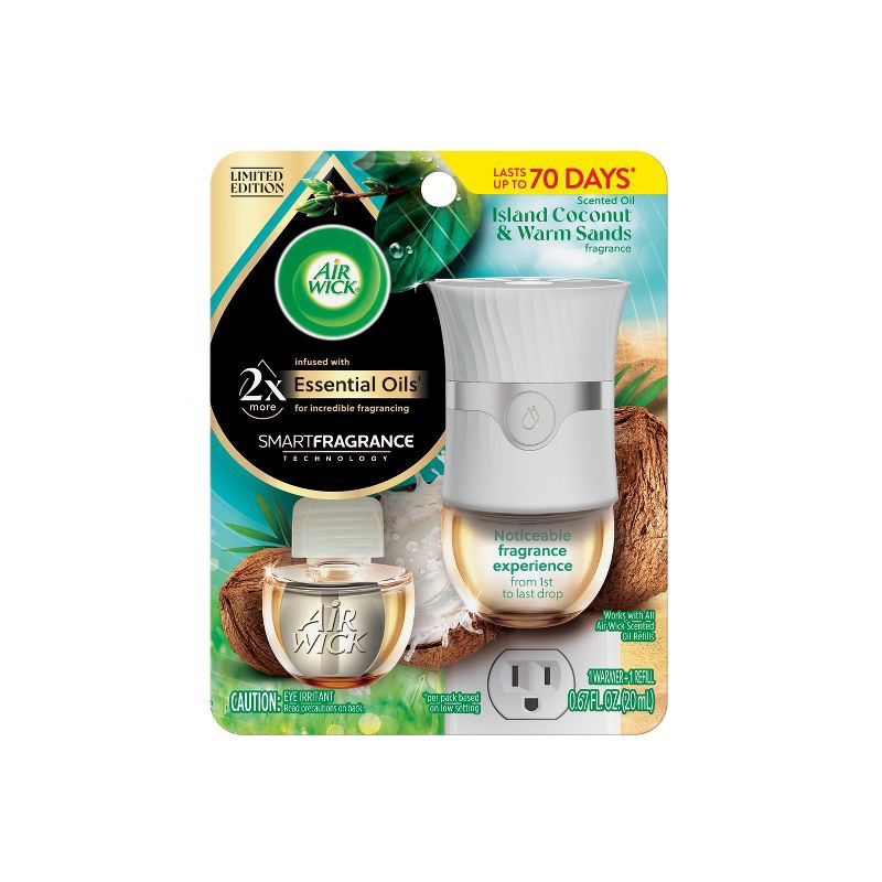 - ANTI-FADING TECHNOLOGY: releases subtle pulses of fragrance for a consistent scent that stays noticeable for up to 70 days on low setting.FRAGRANCE: The essence of a sun-soaked island meets the refreshing breeze of the ocean with the luscious scent of ripe coconut and zesty citrus, that instantly transports you to a beachside haven. 2X MORE ESSENTIAL OILS: Infused with 2x more essential oils vs. regular Air Wick scented oils for a vibrant fragrance experience.FRAGRANCE BOOST ON DEMAND: Touch-activated Boost Mode delivers a 45-minute burst of intensified scent, with top indicator lights signaling when it's active.LOW-REFILL INDICATOR: The low-refill indicator will turn the refill red when it's close to being empty. It works with a timer that calculates the estimated end of life of the refill based on the settings of the device.