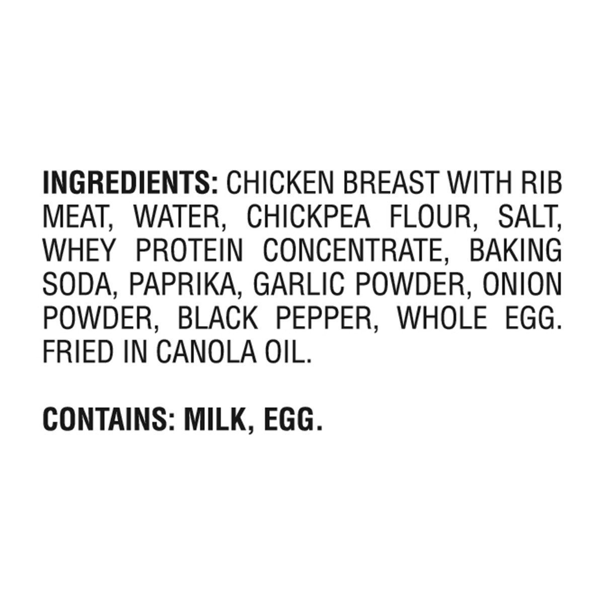 Chicken Breast with Rib Meat, Water, Chickpea Flour, Salt, Whey Protein Concentrate, Baking Soda, Paprika, Garlic Powder, Onion Powder, Black Pepper, Whole Egg, Fried in Canola Oil.
