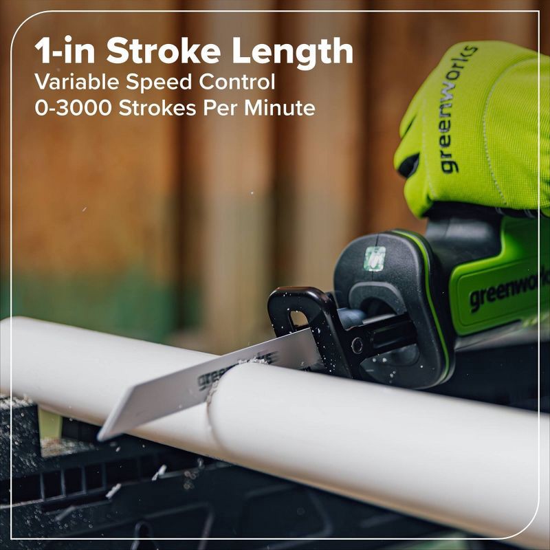 Cut through plywood, drywall, PVC, lumber, and more with the Greenworks POWERALL 24V cordless, brushless reciprocating saw. This lightweight, compact saw delivers up to 3,000 strokes per minute of one…