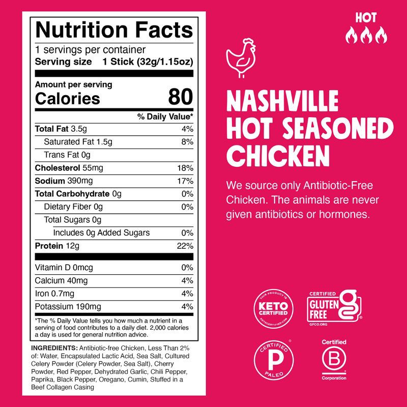 - Bold Flavors: Our Nashville Hot Chicken snack sticks feature a fiery flavor imported straight from Nashville. With a burst of bold heat and savory spices, this flavor gets your taste buds buzzing just like downtown Broadway.